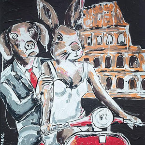 Style Contemporary Figurative Description Vespa Heaven expertly captures the joy of an adventurous spirit, showing Rabbitwoman and Dogman embracing their wild side atop a vibrantly red Vespa. The mix of vivid color and a pop background conveys a sense of exciting possibility and bravado.