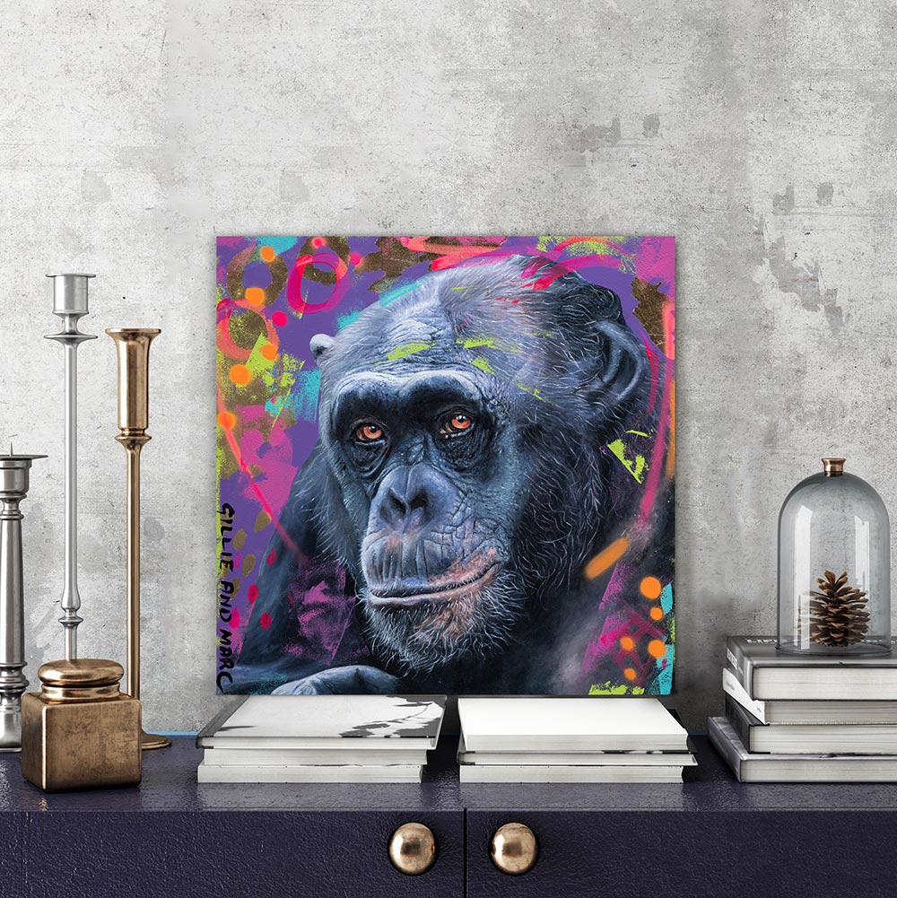 Style Contemporary Figurative, Wildlife, Pop Description The chimpanzee is our closest living relative, sharing about 99 % of our DNA. It’s even thought that we have a common ancestor who lived sometime between 7-13 million years ago! Through research of we have been able to see some of the magical similarities between us and chimpanzees. We all have our own unique personalities, are incredibly social, can learn basic sign-language, and, most importantly use and make tools.