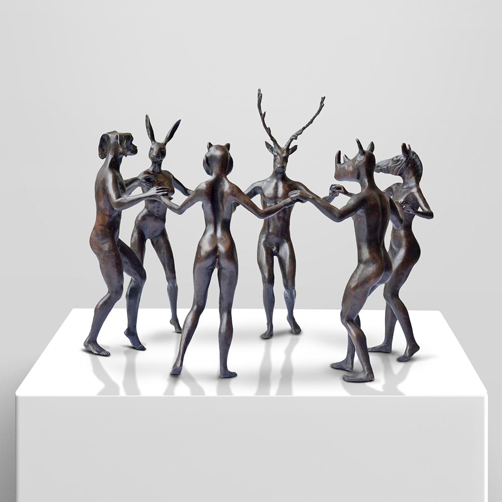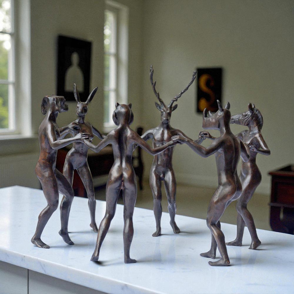 Description This bronze sculpture elegantly portrays Rabbitwoman and Dogman entwined in a joyful dance, encircled by their trusted friends, Zebrawoman, Rhinoman, Deerman, and Tigerwoman. This enchanting scene symbolizes the celebration of unity, diversity, and the interwoven connections between species. It captures the essence of harmony and camaraderie, as these diverse characters join together, transcending boundaries and embracing the beauty of friendship. In this sculpture, we witness the power of love and acceptance, reminding us that together, we can create a world where all beings coexist in harmony and thrive in shared joy.