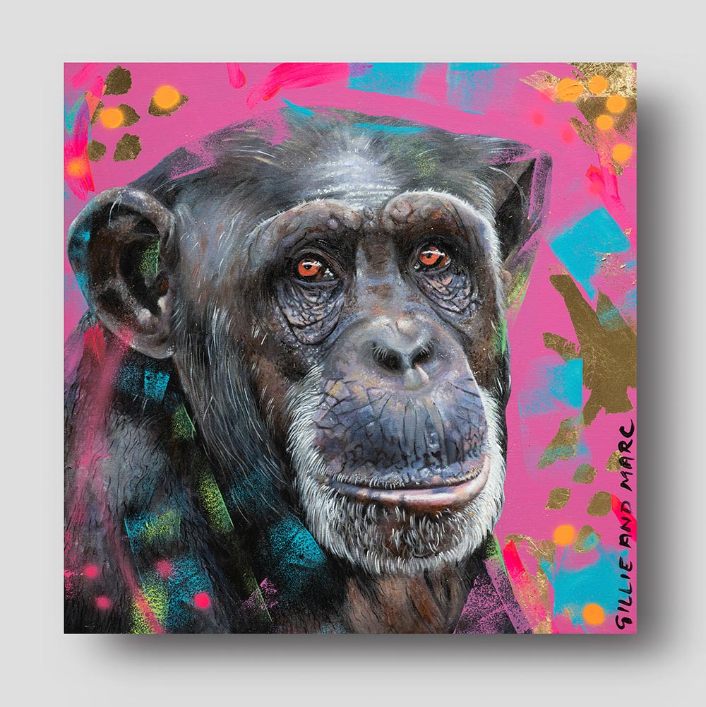 Style Contemporary Figurative, Wildlife, Pop Description The chimpanzee is our closest living relative, sharing about 99 % of our DNA. It’s even thought that we have a common ancestor who lived sometime between 7-13 million years ago! Through research of we have been able to see some of the magical similarities between us and chimpanzees. We all have our own unique personalities, are incredibly social, can learn basic sign-language, and, most importantly use and make tools.