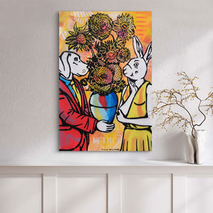 Description In "Flowers for Life," this vibrant and playful artwork depicts a tender moment between Rabbitwoman and Dogman, two anthropomorphic figures engaged in a symbolic exchange of affection. Rabbitwoman, who touches her cheek in admiration, stands before Dogman, dressed in a bright suit, as he presents a bouquet of sunflowers. The lively colors and bold graffiti-like lines add a whimsical energy to the piece, emphasizing the themes of love, connection, and the timeless gesture of giving flowers. The detailed sunflowers, contrasted against the simple figures, evoke a sense of joy and celebration in this imaginative portrayal of life and relationships.