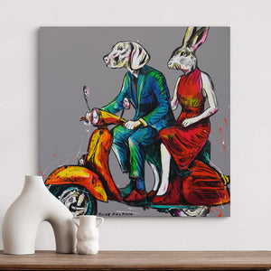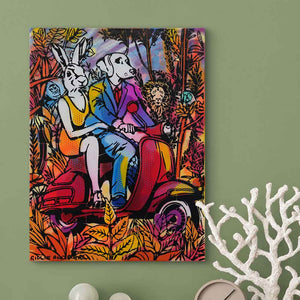 Description In the lively painting titled "Go Go Go All Day," Rabbitwoman and Dogman are depicted cruising in a bright red car, with Rabbitwoman confidently sitting in the passenger seat and Dogman focused on driving. The vibrant stencil and spray paint artwork showcases a background filled with energetic swirls of colorful graffiti, symbolizing motion and excitement. The license plate reads "1 LOVE," highlighting the affectionate bond between the two characters. This dynamic piece captures the essence of an adventurous day, with the couple embracing the thrill of the ride and the joy of being together, exuding a sense of unbridled enthusiasm and love for life.