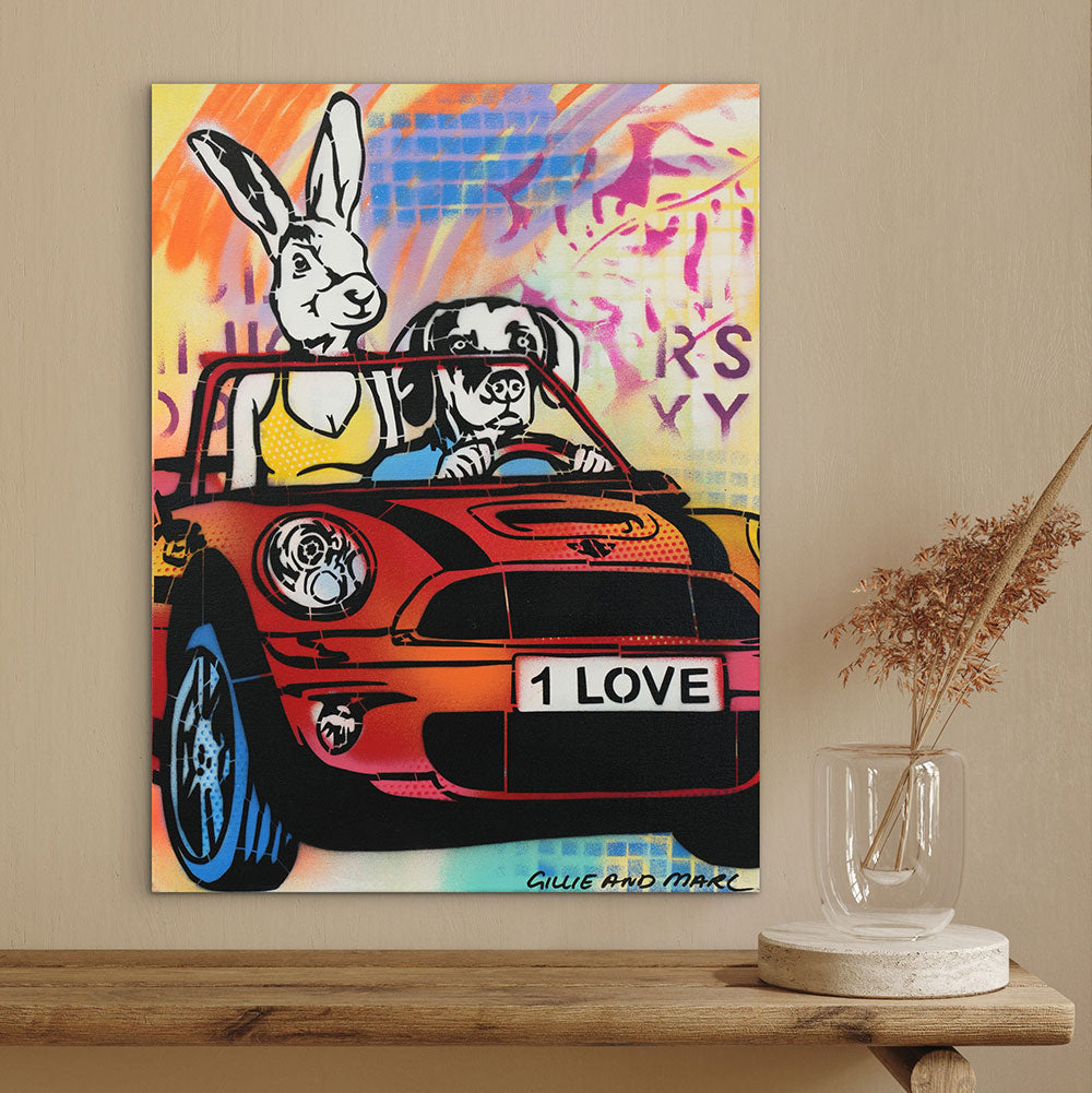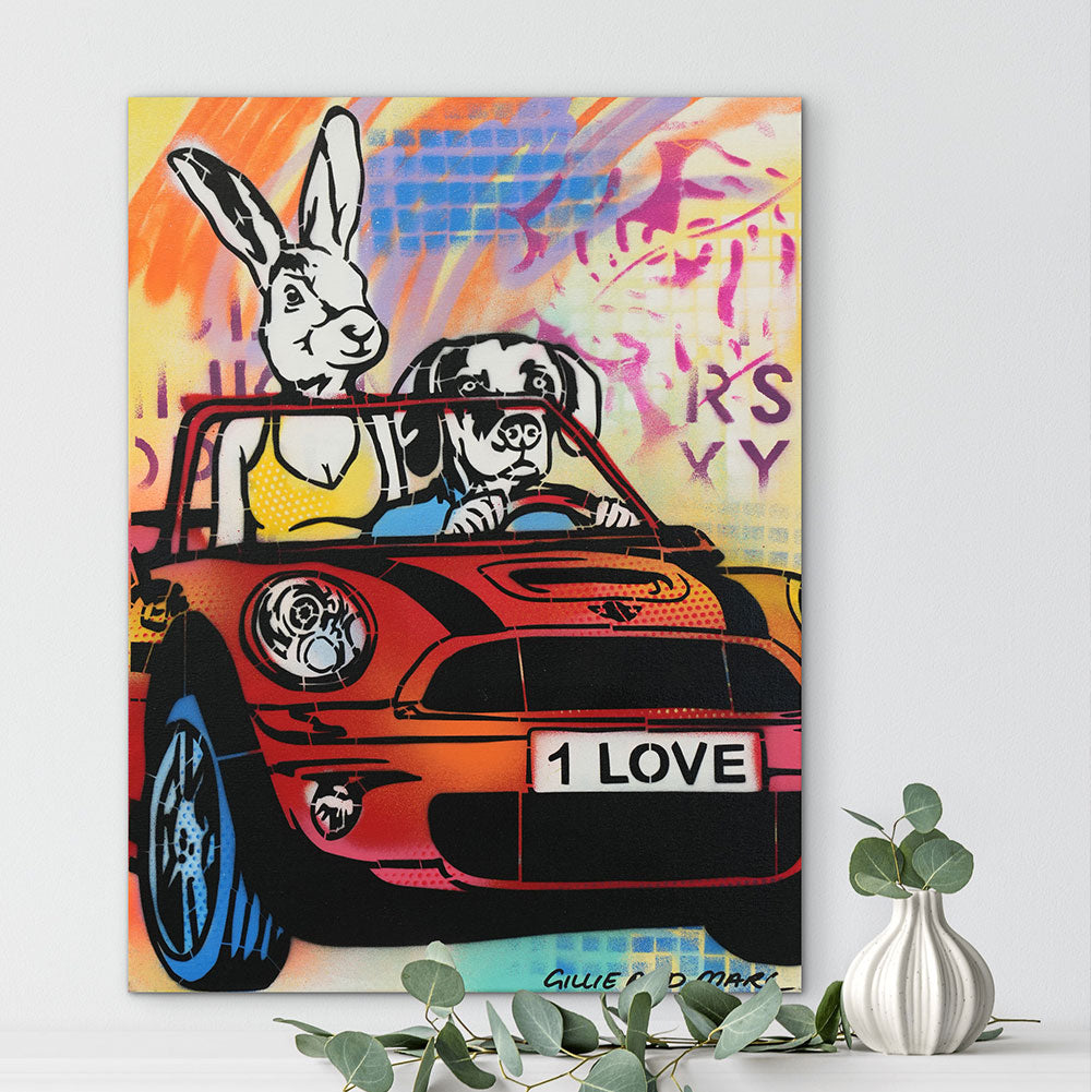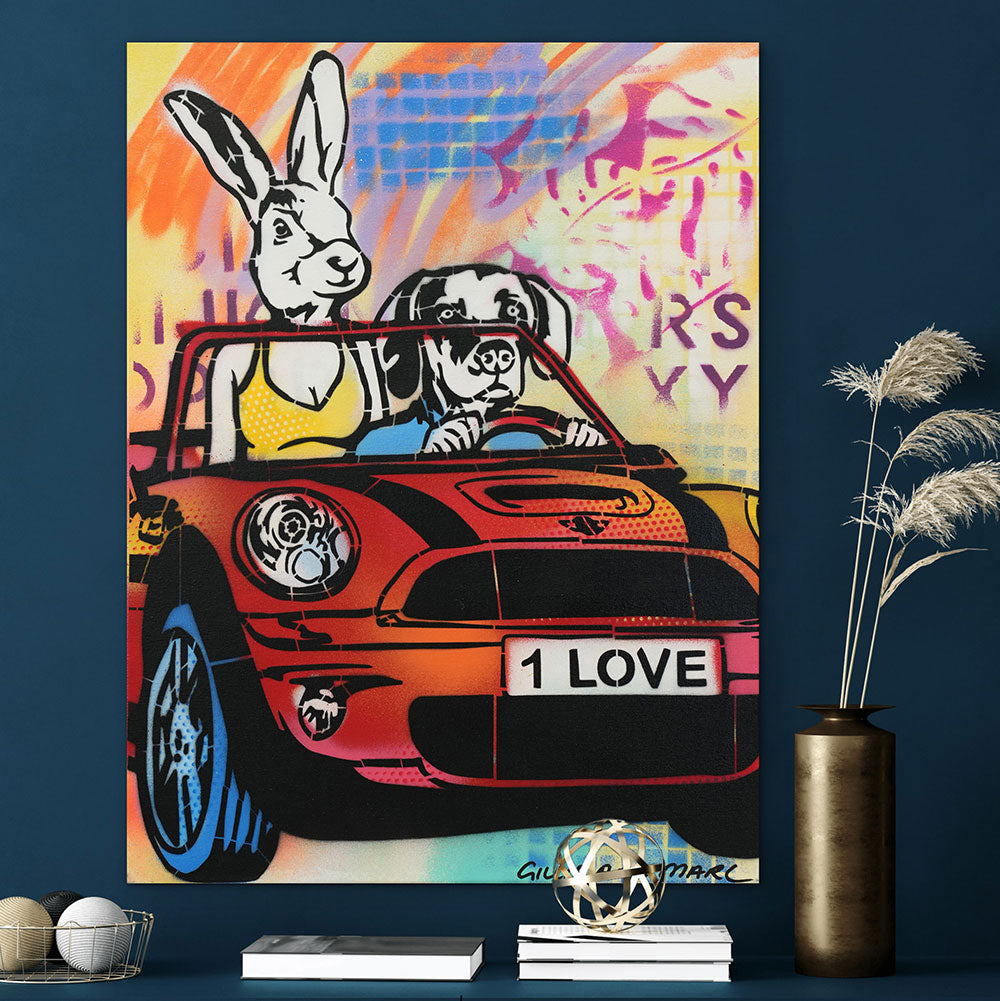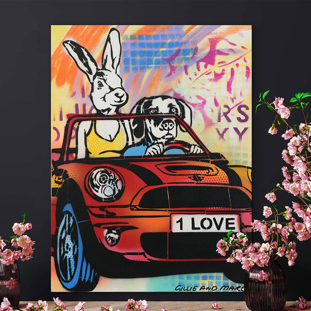 Style Contemporary Pop Art, Romanticism, Adventure Description Dogman loved Rabbitwoman with all of his heart, he felt like words could never do justice for just how much he felt for his love. He tried to show her in so many ways, like surprising her with flowers in the middle of the day. Rabbitwoman felt all the ways he expressed his heart, she knew he was her one true love. Artwork Features Gillie and Marc’s latest work is an exciting explosion between their painting and sculpture. With a love for both 2D and 3D work they have created a unique style of work which are in essence sculptured paintings.