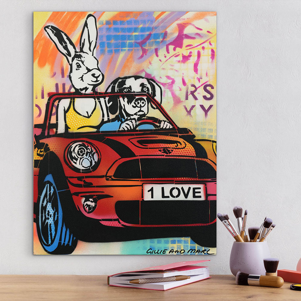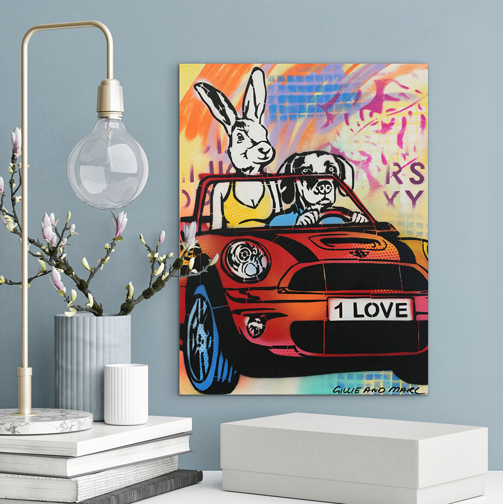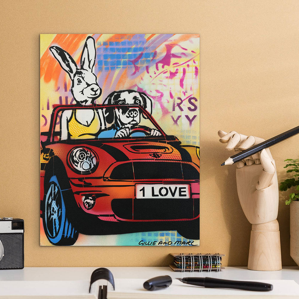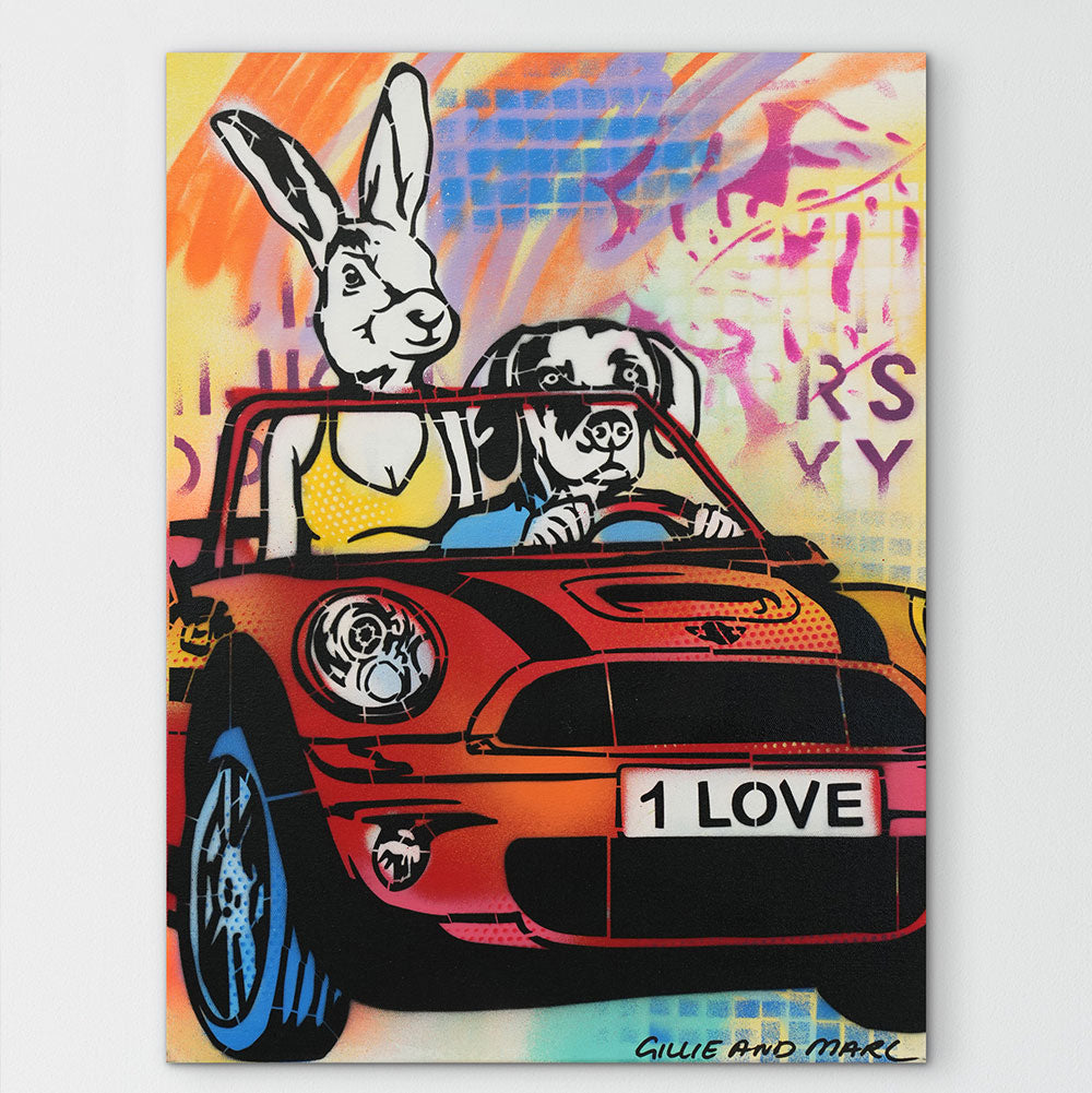 Style Contemporary Pop Art, Romanticism, Adventure Description Dogman loved Rabbitwoman with all of his heart, he felt like words could never do justice for just how much he felt for his love. He tried to show her in so many ways, like surprising her with flowers in the middle of the day. Rabbitwoman felt all the ways he expressed his heart, she knew he was her one true love. Artwork Features Gillie and Marc’s latest work is an exciting explosion between their painting and sculpture. With a love for both 2D and 3D work they have created a unique style of work which are in essence sculptured paintings.