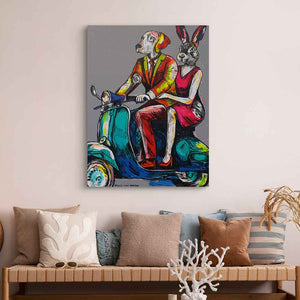 Description "Go, Go, Go!" depicts the exhilarating journey of Dogman and Rabbitwoman, two Vespa-loving soulmates, as they embark on an adventure fueled by joy and passion. Riding together on their iconic Vespa scooter, they symbolize the boundless energy and excitement of shared experiences and mutual love. The pop background with its vibrant colors serves as a reflection of the dynamic and electrifying nature of their journey, emphasizing the sense of freedom and exhilaration that comes with embracing life's adventures. This painting celebrates the beauty of love, companionship, and the thrill of exploration, reminding viewers of the joy that can be found in living life to the fullest alongside those we hold dear.