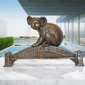 "The Big Koala Loved the Sydney Harbour Bridge" is a heartwarming bronze sculpture depicting a giant koala playfully climbing over the iconic Sydney Harbour Bridge. As a beloved symbol of Australia, the koala represents resilience, curiosity, and the deep connection between nature and human achievement. This whimsical yet meaningful piece highlights the harmony that can exist between wildlife and architectural wonders, encouraging admiration for both the natural world and human ingenuity. Through its joyful expression, the sculpture invites viewers to celebrate conservation and progress working together. By capturing the koala’s adventurous spirit, the artwork conveys a message of hope, unity, and the beauty of our shared environment.