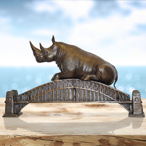 "The Big Rhino Loved the Sydney Harbour Bridge" is a striking bronze sculpture depicting a magnificent rhino playfully climbing over the iconic Sydney Harbour Bridge. As a symbol of strength, resilience, and conservation, the rhino’s adventurous journey across this world-famous landmark represents the powerful connection between nature and human achievement. This captivating piece highlights the potential for harmony between wildlife and architectural marvels, inspiring admiration for both the natural world and human ingenuity. With its dynamic presence, the sculpture encourages viewers to embrace the importance of conservation and progress working hand in hand. By showcasing the rhino’s bold and curious spirit, the artwork delivers a message of hope, unity, and appreciation for our shared world.