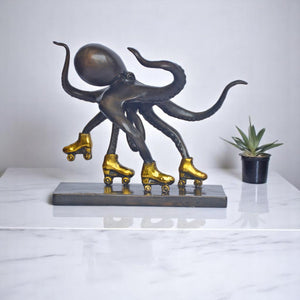 The Giant Pacific Octopus Races Against Time on Roller Skates" is a bold and imaginative bronze sculpture that captures urgency with a twist of whimsy. Featuring the majestic octopus speeding forward on roller skates, it symbolises the race against extinction faced by our oceans’ most intelligent and mysterious creatures. As climate change, pollution, and overfishing threaten marine life, this sculpture reminds us that time is running out — and the need for action is immediate. It’s a playful yet powerful call to protect what’s beneath the surface before it’s too late.