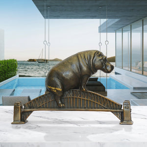 The sculpture titled "The Hippo Loved the Sydney Harbour Bridge" is a striking and whimsical representation of an endangered hippo perched atop the iconic Sydney Harbour Bridge. This imaginative piece symbolizes the intersection of nature and urban development, highlighting the delicate balance between preserving wildlife and advancing human infrastructure. The hippo, an emblem of vulnerability and resilience, serves as a poignant reminder of the environmental challenges faced by endangered species in the modern world. By placing the hippo in such a prominent urban setting, the sculpture encourages viewers to reflect on the impact of human activity on natural habitats and inspires a commitment to conservation efforts. Its playful yet profound presence invites onlookers to envision a world where harmony between nature and civilization is not only possible but essential.