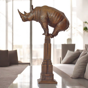 The Rhino Loved the Empire State Building is a bronze sculpture portraying an endangered rhino courageously climbing the iconic skyscraper. The rhino, a symbol of power and vulnerability, contrasts with the Empire State Building — a beacon of human achievement and urban expansion. This bold juxtaposition highlights the growing tension between nature and modern development. As the rhino ascends, it represents wildlife’s struggle to find its place in an increasingly urban world. The piece is a powerful reminder of our responsibility to protect endangered species like the rhino while we continue to build and innovate.