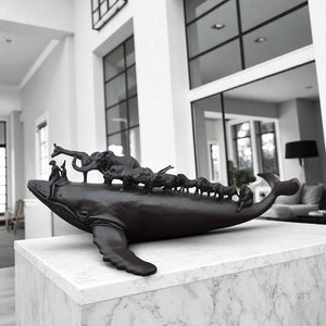 On a gigantic humpback whale stands a gathering of the planet’s most endangered creatures. Each animal is a reminder of the shared journey toward survival and the fragile balance of life.