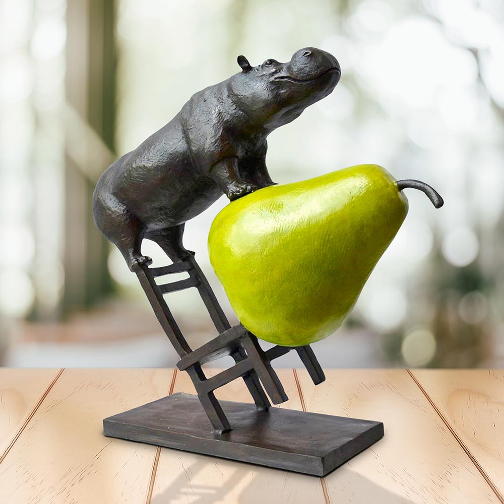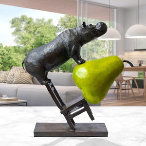 The sculpture depicts a hippo that is trying to balance itself delicately on a chair with a pear. It is a beautiful representation of endangered species and the difficulties they face in balancing safely and living within the ecosystem. The hippo's balance represents the fragility of the natural balance and ecosystem, and how the slightest thing can make all the difference on whether species survive and thrive or not. The pear, a delicious fruit that we often take for granted represents the human impact on the environment and the expanding farming or urban habitat at the expense of wildlife habitats. The sculpture is a reminder that humans are responsible for protecting endangered species like hippos, or else their delicate balancing act in nature will have dire consequences.