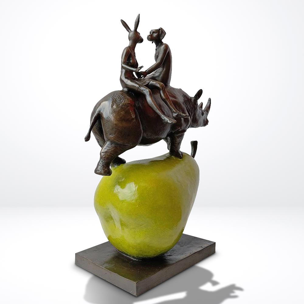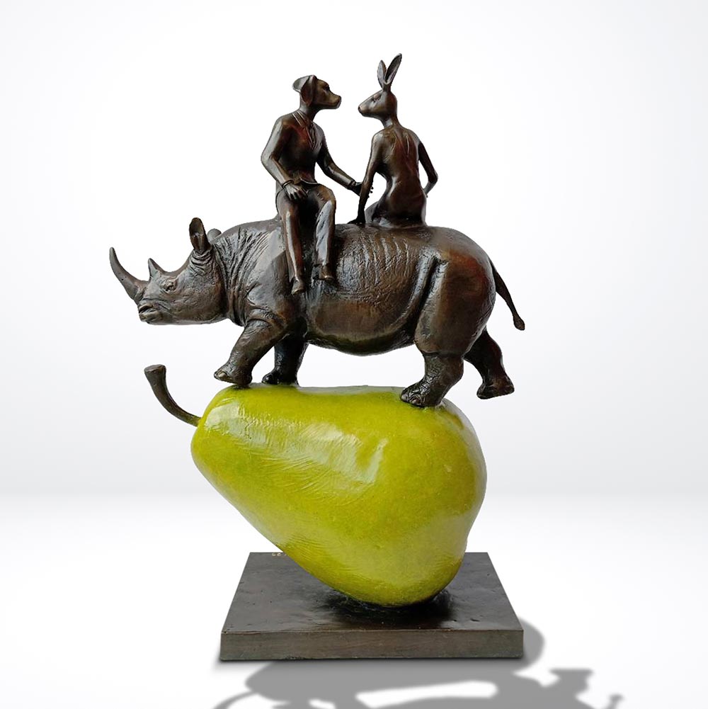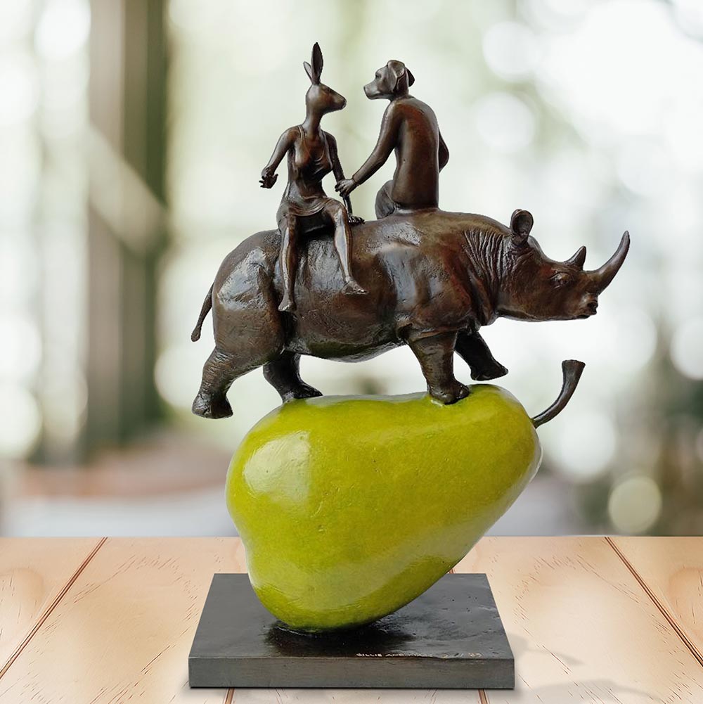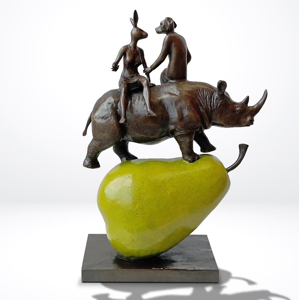 The sculpture depicts a visually striking scene featuring a rhinoceros balancing on top of a large pear, with the captivating addition of Rabbitwoman and Dogman sitting on the back of the rhino. The rhino symbolizes strength and resilience, demonstrating its ability to balance with grace and stability. The pear represents the fragility and delicate nature of our environment, highlighting the need for conservation and protection. Rabbitwoman and Dogman, iconic figures in Gillie and Marc's art, represent the harmonious coexistence between different species, promoting the notion of unity and empathy. Together, this sculpture serves as a playful yet thought-provoking commentary on the interconnectedness of humans, animals, and the environment, urging viewers to reflect on their role in preserving the delicate balance of our natural world.