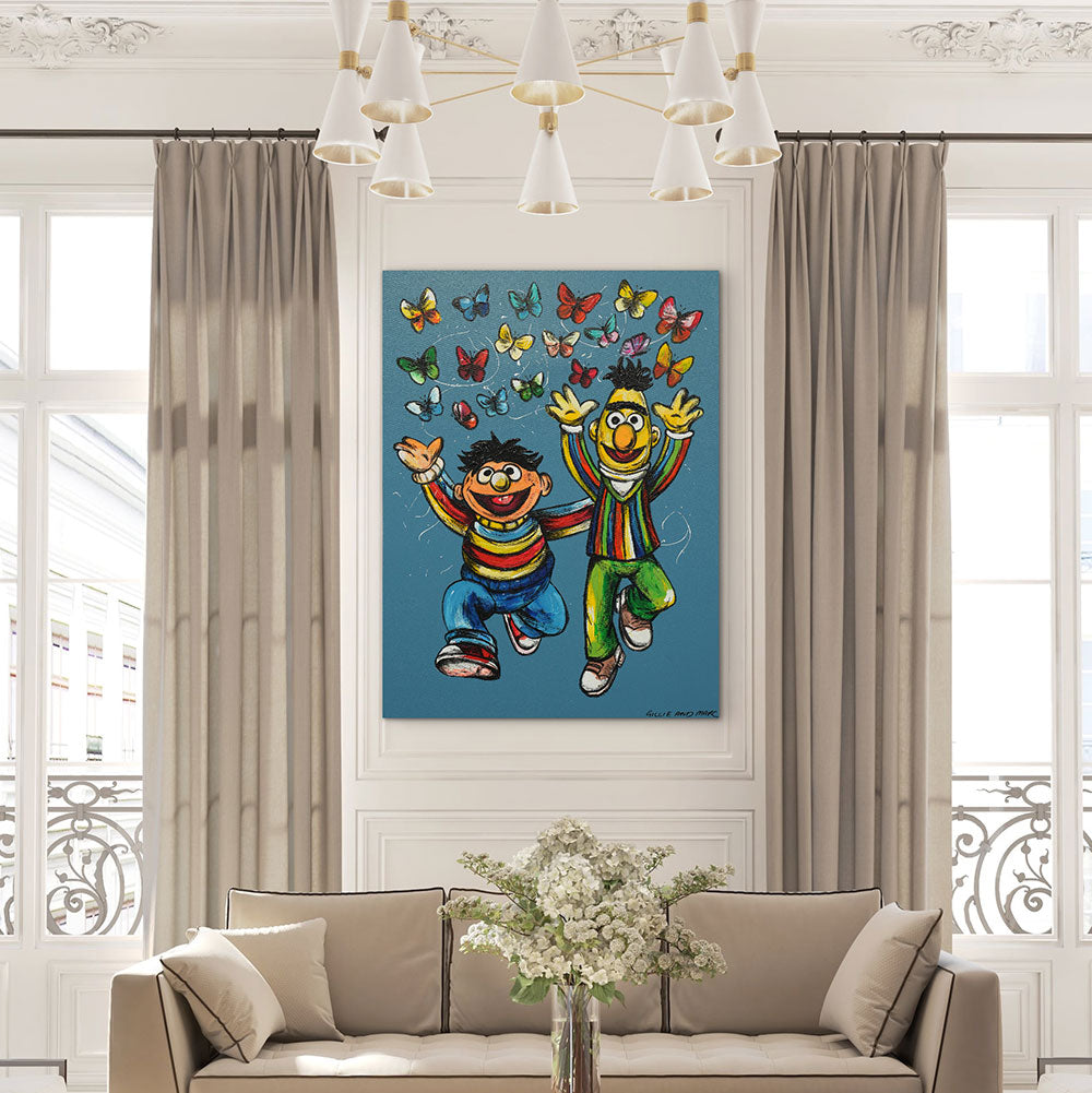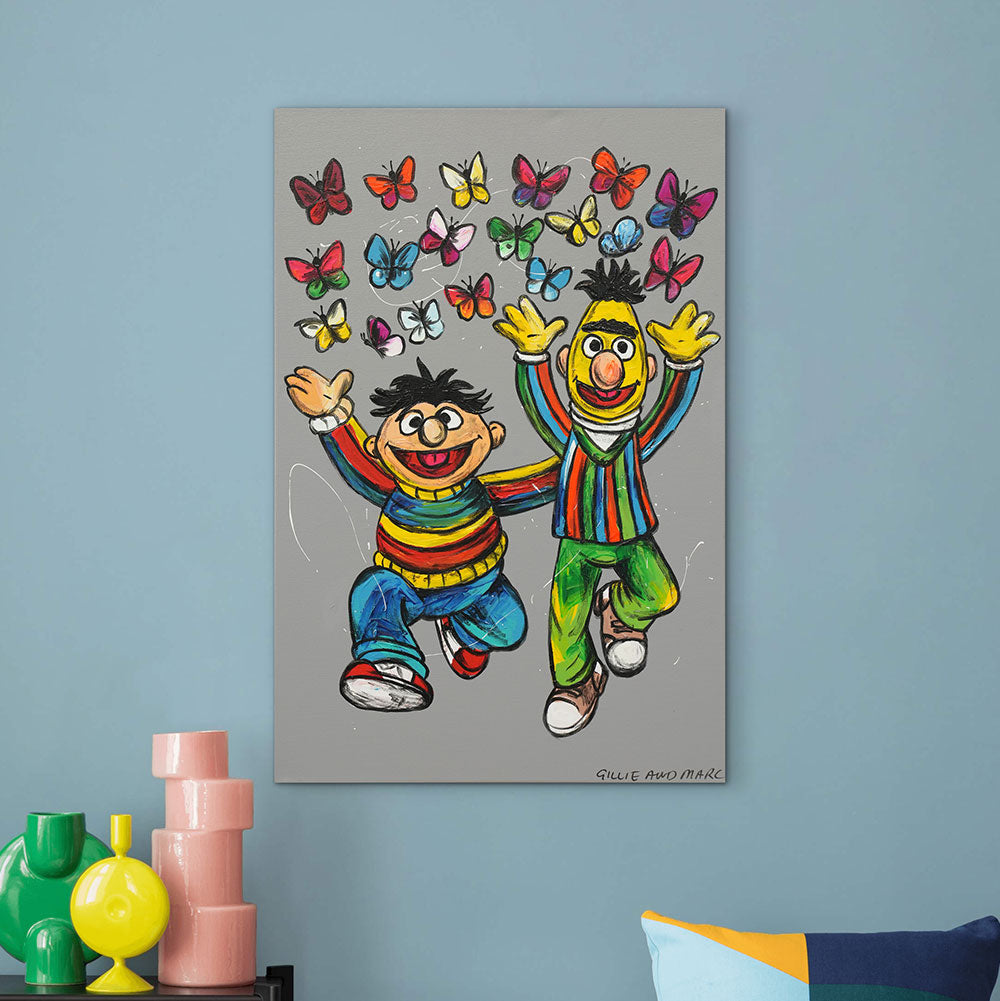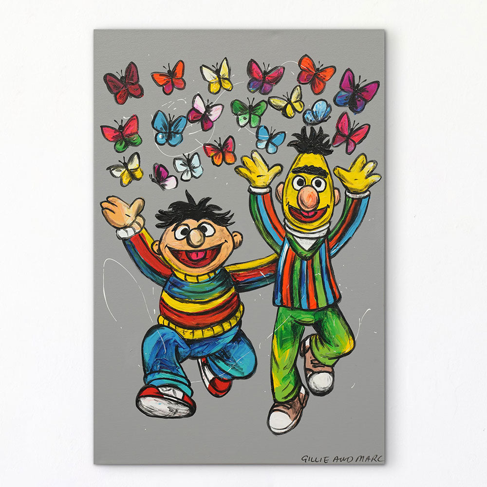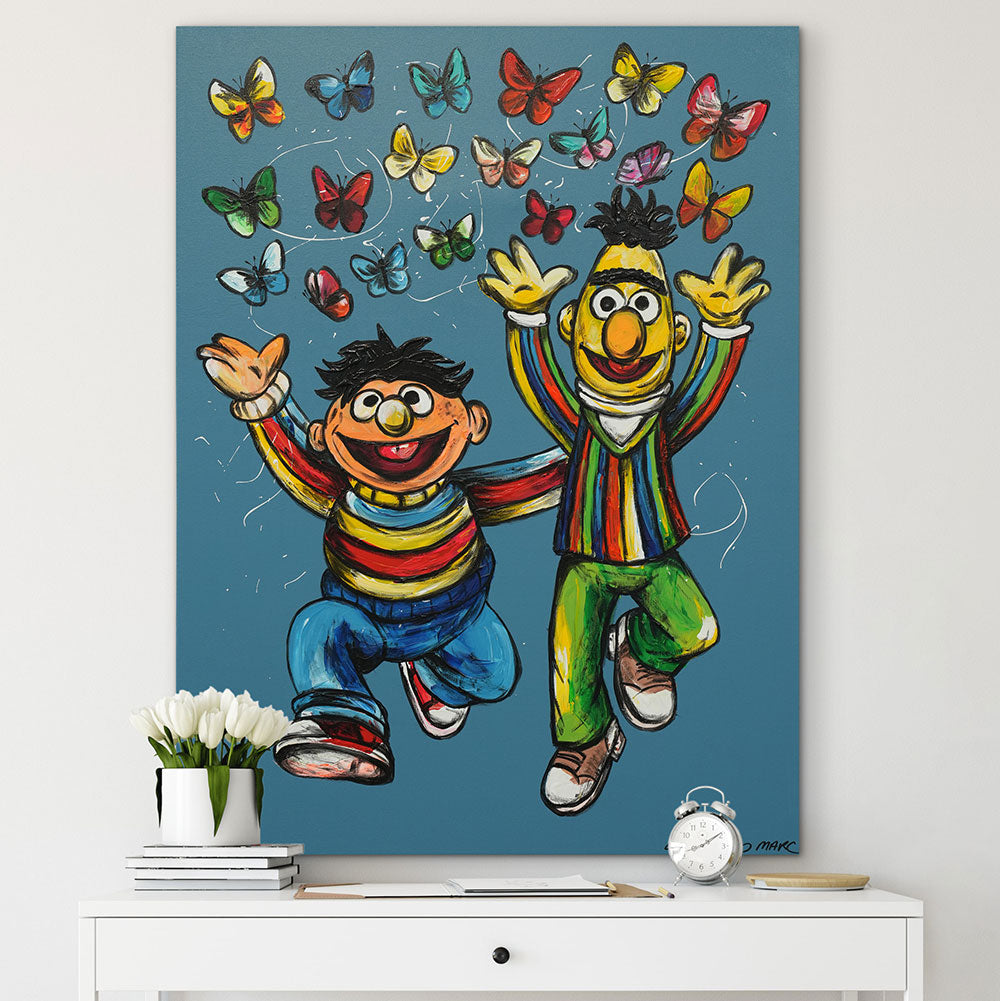 Description Bert and Ernie Were Best Friends bursts with pure joy and colour, celebrating the magic of lifelong friendship. Painted with expressive brushstrokes and vibrant hues, the iconic duo leaps into the air as a flurry of butterflies dances above them — a symbol of freedom, happiness, and the beauty of shared moments. This playful, heartwarming work invites viewers to reconnect with their inner child and embrace the simple delight of being with someone who understands you completely.