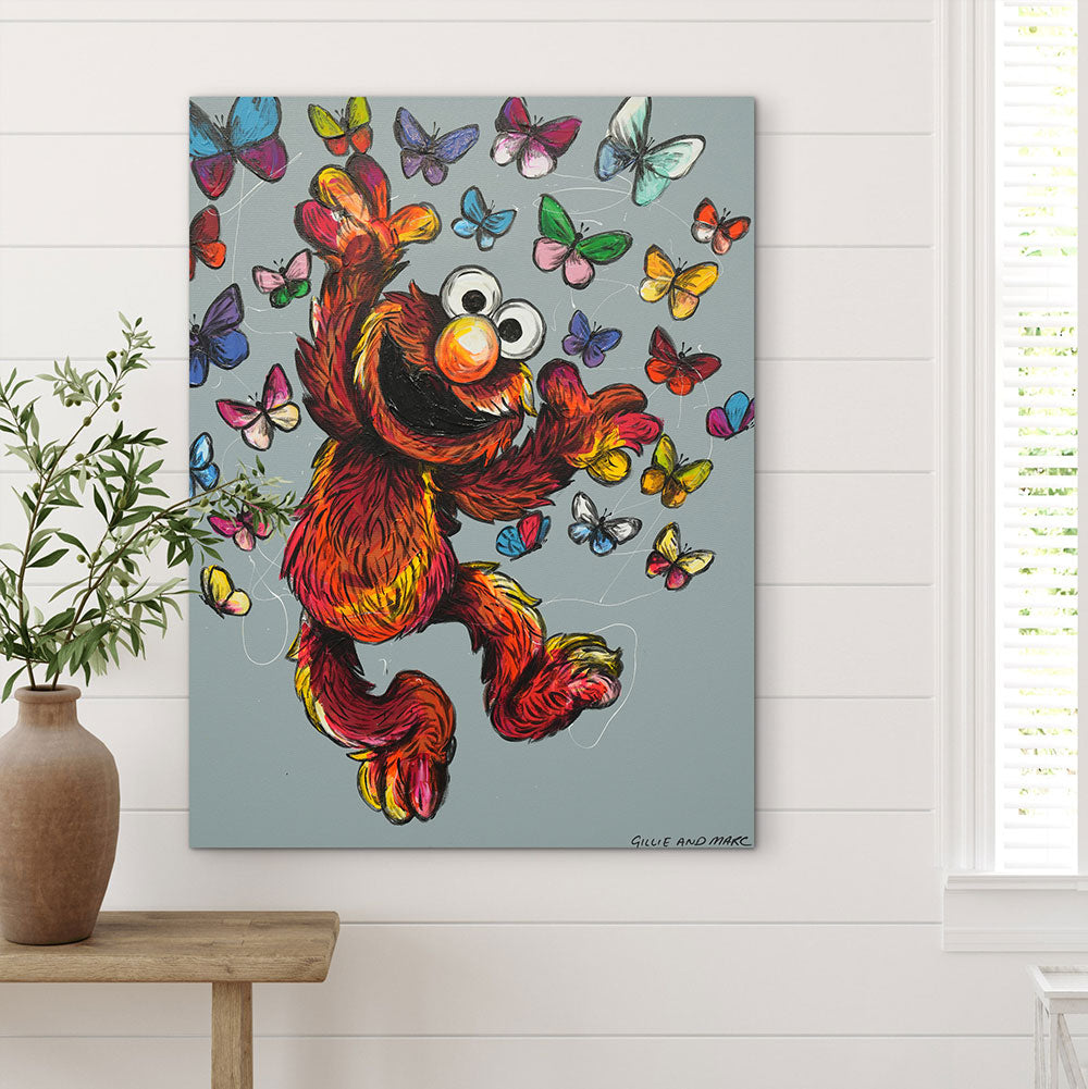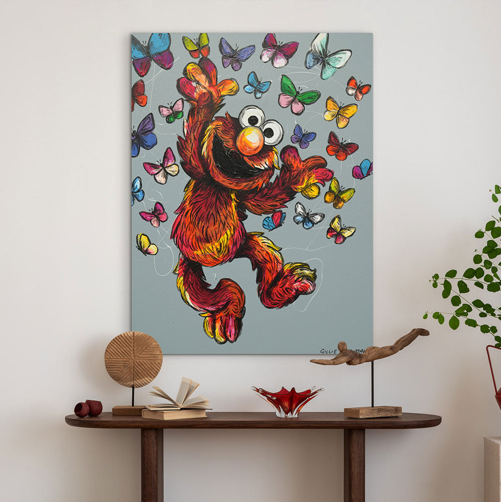 Description Elmo Is on a High captures the purest form of joy — that unstoppable, childlike exuberance that makes the whole world feel lighter. Bursting with vibrant reds, oranges, and yellows, Elmo leaps into a cloud of fluttering butterflies, each one painted in lively, glowing colours. The butterflies swirl around him like tiny sparks of happiness, symbolising freedom, imagination, and the magic found in simple pleasures. This uplifting artwork radiates positivity, reminding viewers to embrace moments of play, wonder, and unfiltered delight.