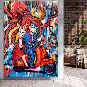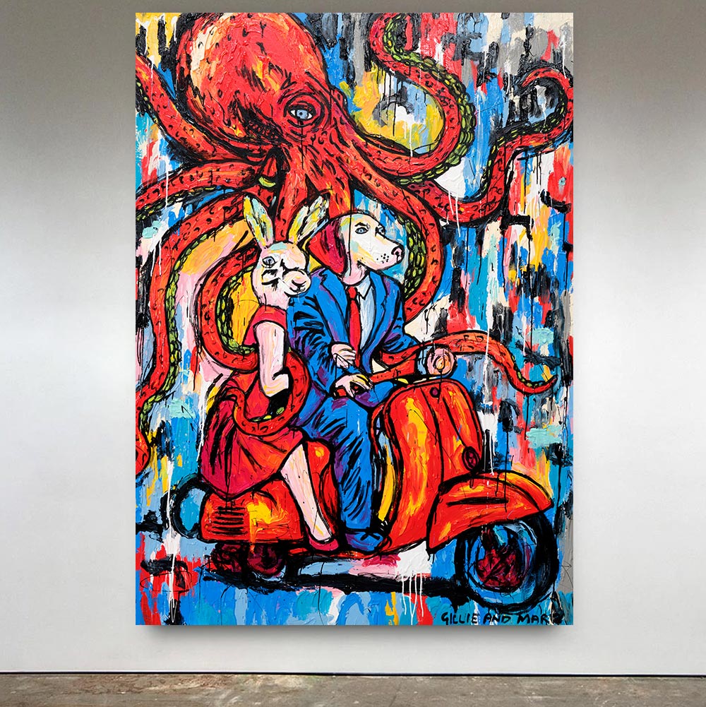 This is a captivating painting that transports viewers into a whimsical and fantastical world. In this vibrant artwork, the scene unfolds with Rabbitwoman and Dogman riding a vibrant red Vespa through a dreamlike pop landscape. The wind tousles their ears as they embark on a thrilling journey. Behind them, a colossal octopus emerges from the depths of the sea, its tentacles gracefully swirling in pursuit. The painting exudes a sense of exhilaration and wonder, inviting viewers to imagine the extraordinary adventures that await these extraordinary beings.