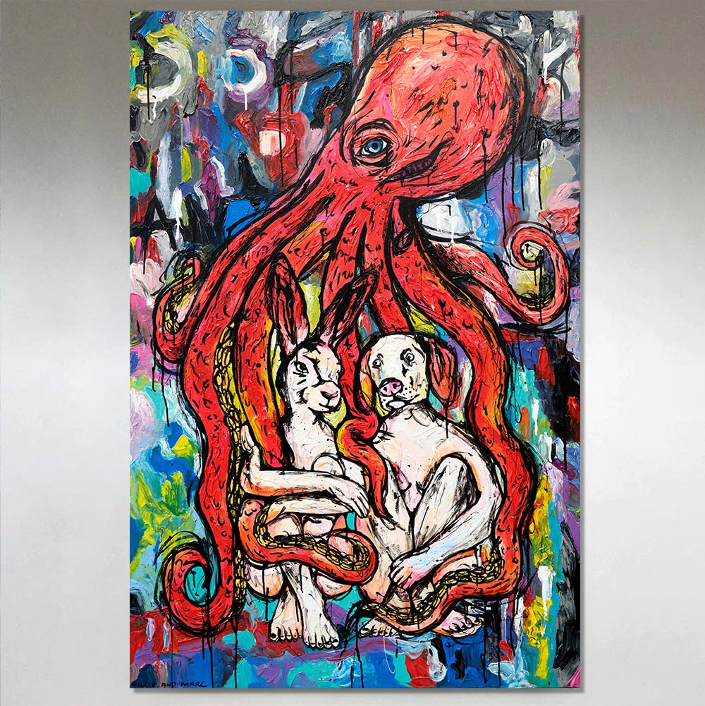 This painting is a unique and captivating depiction of love and connection with a vivid color palette. It features Dogman and Rabbitwoman surrounded by the arms of a giant octopus, symbolizing the power of friendship and unity. The painting's title, "Arms of Love," reflects the painting's message of acceptance and belonging.