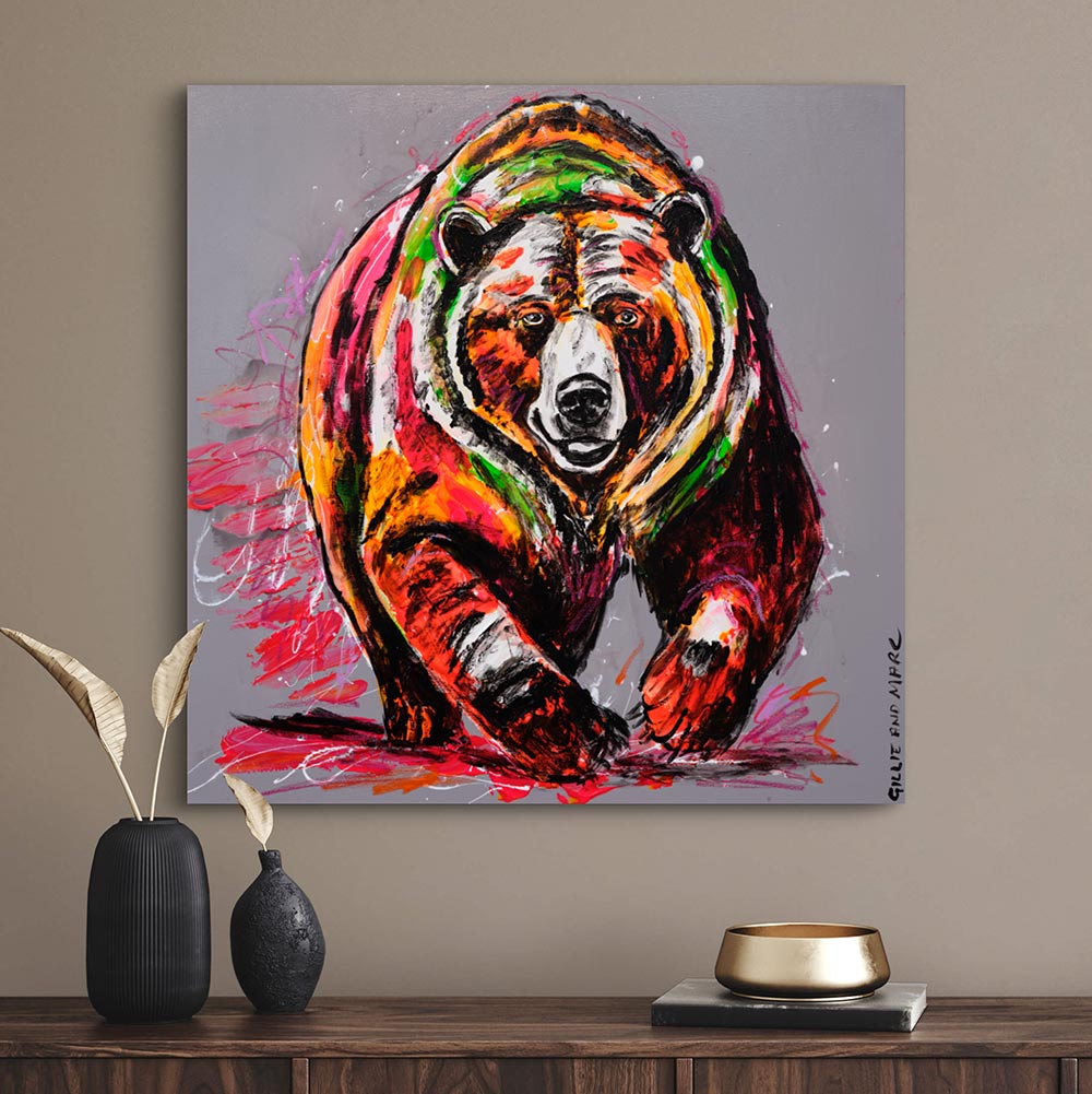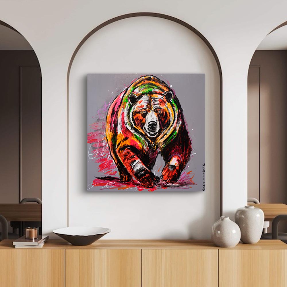 This captivating piece, titled "Bear of Kindness," beautifully captures the gentle yet powerful essence of a bear in a vibrant, abstract manner. The striking use of colors—red, orange, and green—against a subdued background highlights the warmth, compassion, and nurturing spirit that this majestic creature symbolizes. The bear’s soft yet determined expression invites viewers to embrace kindness and empathy in their own lives. Each brushstroke is filled with energy and emotion, bringing the bear to life in a way that is both enchanting and inspiring. "Bear of Kindness" serves as a poignant reminder that true strength lies in gentleness and understanding.
