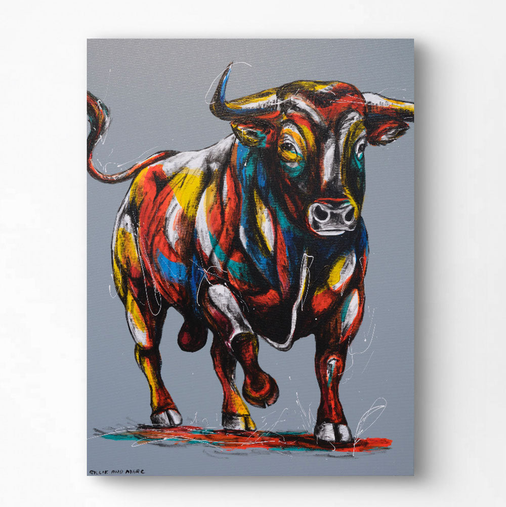 Bull Wins It All is a bold celebration of strength, dominance, and untamed energy, captured in a moment of unstoppable motion. With its powerful stance and forward momentum, the bull charges through the canvas with fiery confidence, painted in a dazzling array of reds, yellows, blues, and blacks that pulse with life. The cool grey background enhances the explosive palette, allowing the vibrant colors to leap forward and draw the viewer into the action. Gillie and Marc’s expressive style highlights the bull’s muscular form and fierce gaze, turning it into a symbol of power, persistence, and triumph against all odds.