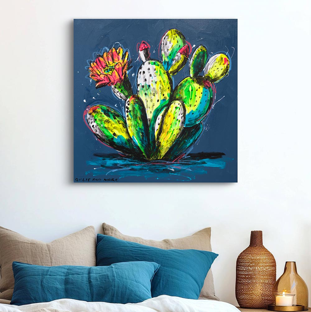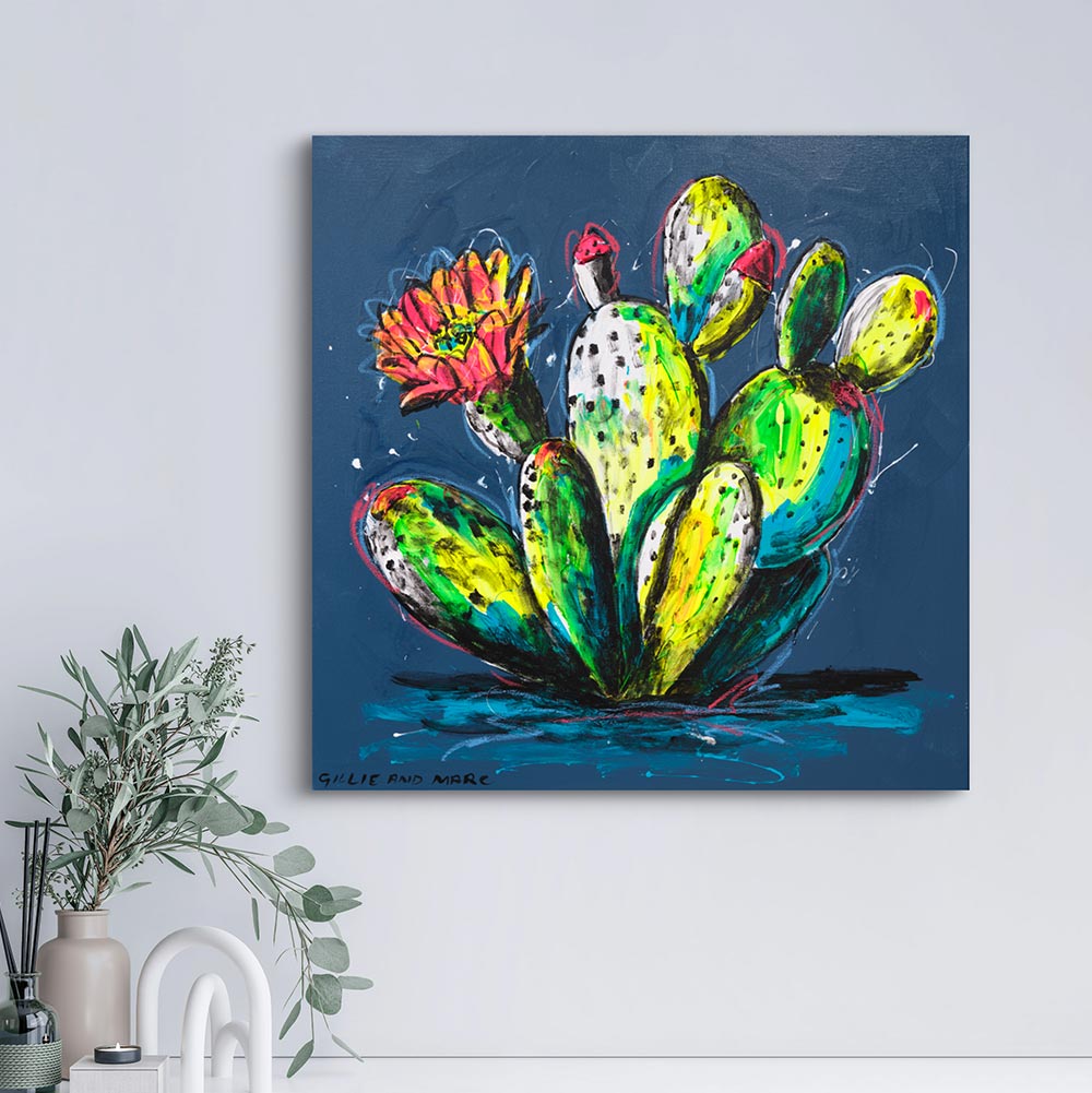 "Cactus Beauty" is a captivating painting that brings the desert flora to life with vibrant colors and dynamic brushstrokes. The cactus, depicted in bright greens and yellows, stands out against the deep blue background. Its striking flower, blooming in shades of red and orange, adds a touch of warmth and contrast to the composition. The painting captures the essence of resilience and beauty found in the harsh desert environment, making it a perfect piece to add a splash of color and a sense of nature's strength to any space.