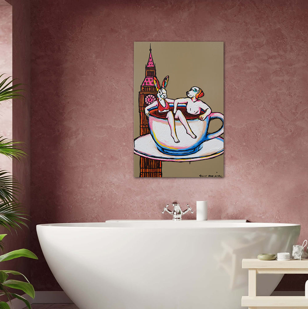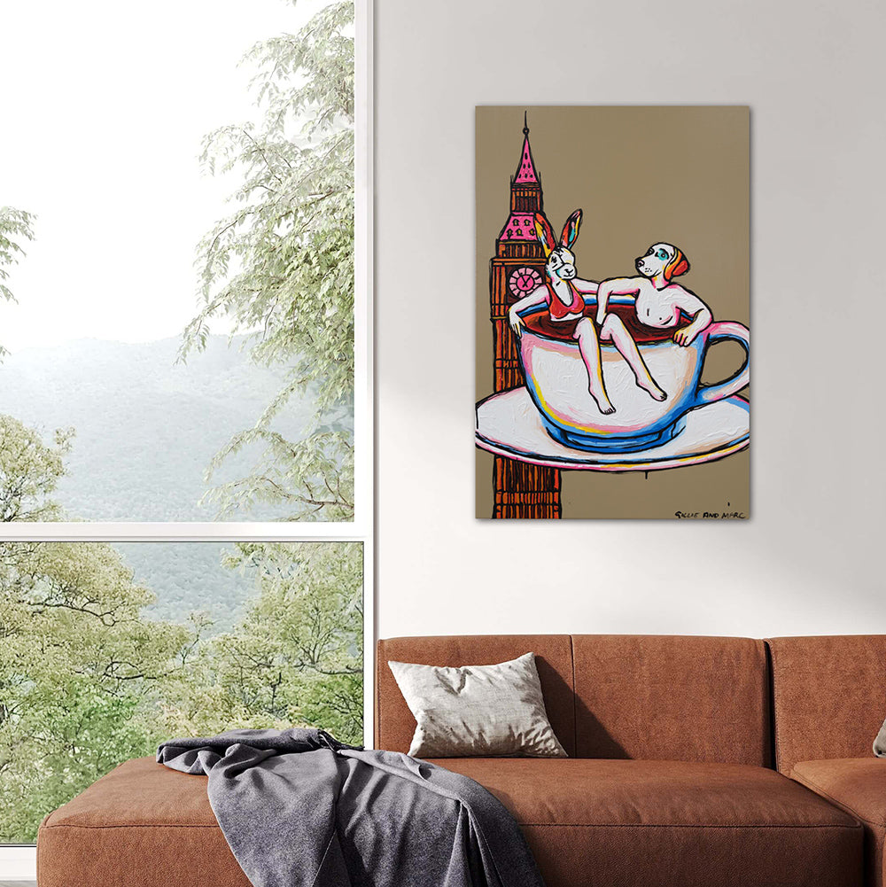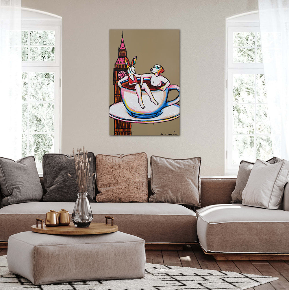 “Coffee near Big Ben" captures a whimsical moment in the heart of London as Rabbitwoman and Dogman find solace inside a coffee cup, their cozy retreat offering a front-row seat to the grandeur of Big Ben. Amidst the hustle and bustle of the city, the duo shares a serene moment, savoring the aroma of freshly brewed coffee and the majestic view of the iconic clock tower. The painting radiates warmth and intimacy, with Rabbitwoman and Dogman's camaraderie epitomizing the simple joys of companionship. Through its charming depiction, the artwork invites viewers to pause and appreciate life's small pleasures, reminding us that even amidst the bustling cityscape, moments of tranquility and connection can be found.