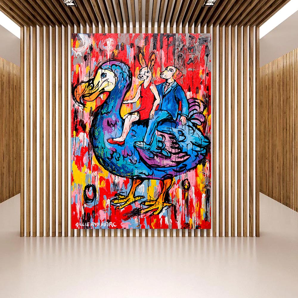In this whimsical painting, Dogman and Rabbitwoman are depicted riding a giant, oversized dodo bird. This artwork embodies a sense of playful imagination and adventure. The presence of the dodo, an extinct species, adds an element of fantasy and wonder to the scene. It symbolizes the idea of embracing the extraordinary and finding joy in the unexpected. This painting encourages us to embrace our inner child, to explore new possibilities, and to approach life with a sense of curiosity and wonder.