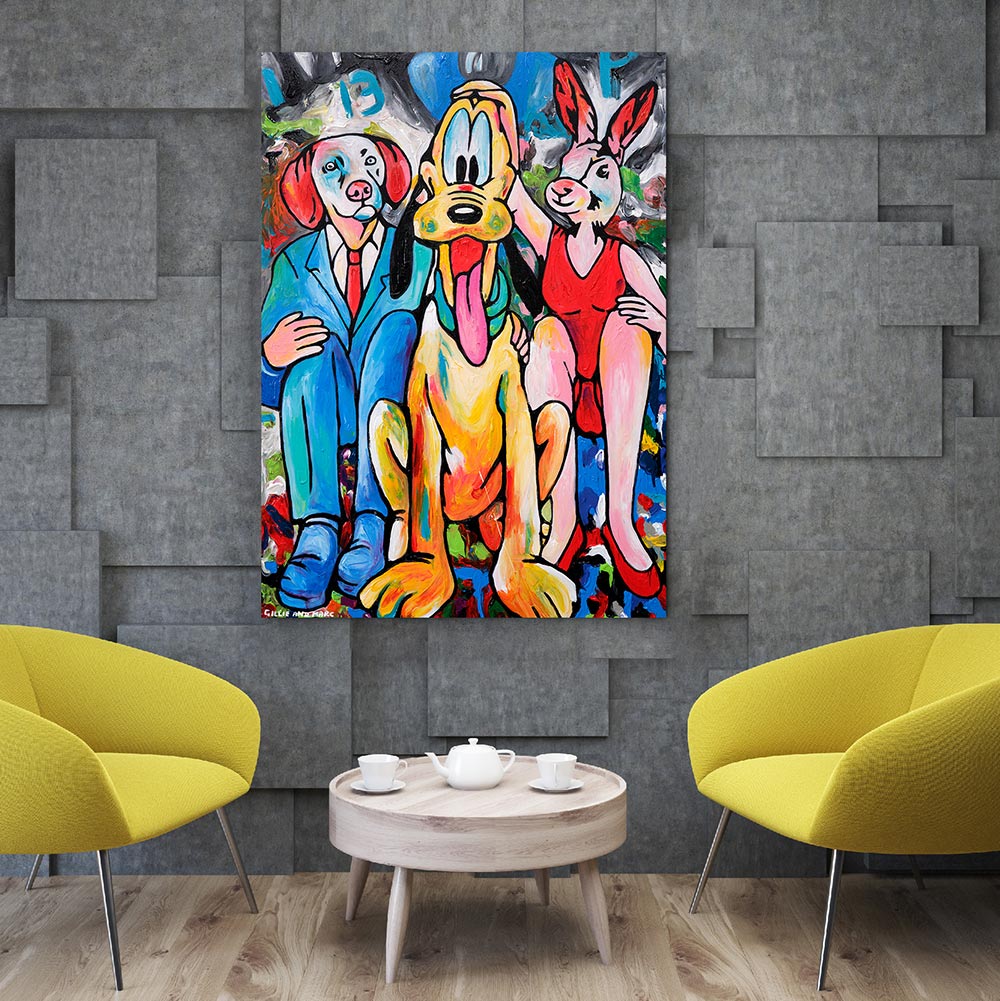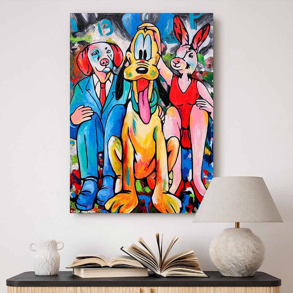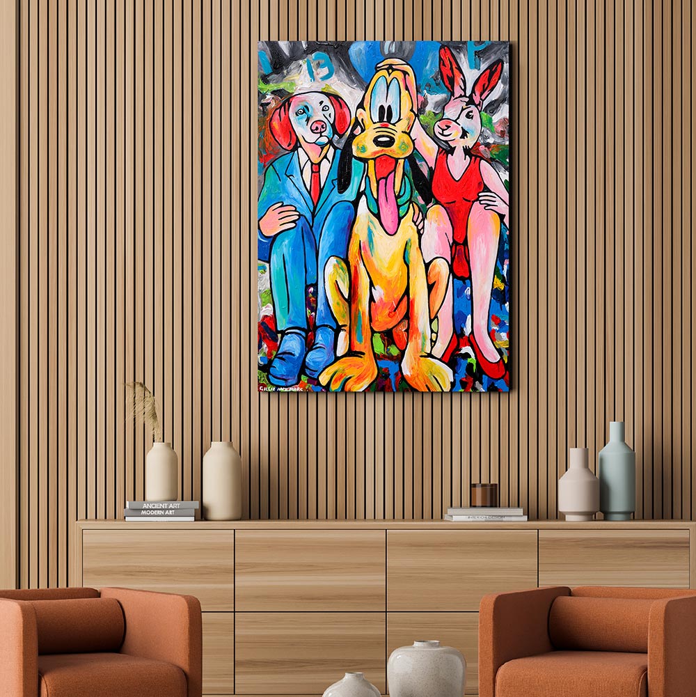 "Eternal Bonds" is a captivating painting that captures the timeless essence of friendship and loyalty. At its heart is Pluto, the beloved Disney character, surrounded by his steadfast companions, Dogman and Rabbitwoman. Pluto, with his endearing charm and playful demeanor, serves as the focal point of the composition. Despite his anthropomorphic features, his expression radiates warmth and sincerity, symbolizing the enduring bond he shares with his friends. Dogman stands by Pluto's side, embodying loyalty, strength, and unwavering support. His presence exudes a sense of protection and companionship, highlighting the depth of their connection. Meanwhile, Rabbitwoman brings a touch of grace and agility to the scene, her playful antics adding a sense of whimsy and joy to the painting. The background of "Eternal Bonds" is a textured tapestry of colors, with layers of paint blending and swirling together. This textured backdrop adds depth and complexity to the composition, mirroring the rich tapestry of emotions that define the bonds of friendship. Overall, "Eternal Bonds" is a celebration of the enduring power of friendship and the profound connections that unite us. It serves as a reminder of the importance of loyalty, companionship, and unconditional love in our lives, inviting the viewer to cherish the relationships that enrich and sustain us.