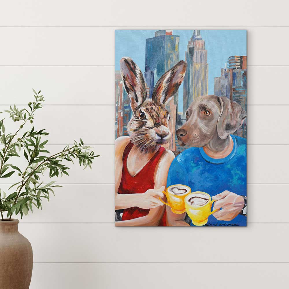 An inviting contemporary scene featuring Rabbitwoman and Dogman enjoying coffee together in the heart of the city. With the Manhattan skyline rising behind them, the pair share a quiet moment over matching yellow cups, the latte art forming subtle hearts. Warm, expressive brushstrokes capture the glow of companionship and the romance of an urban café date. Signed by the artists, this piece radiates love, comfort, and the simple pleasure of a shared flat white.