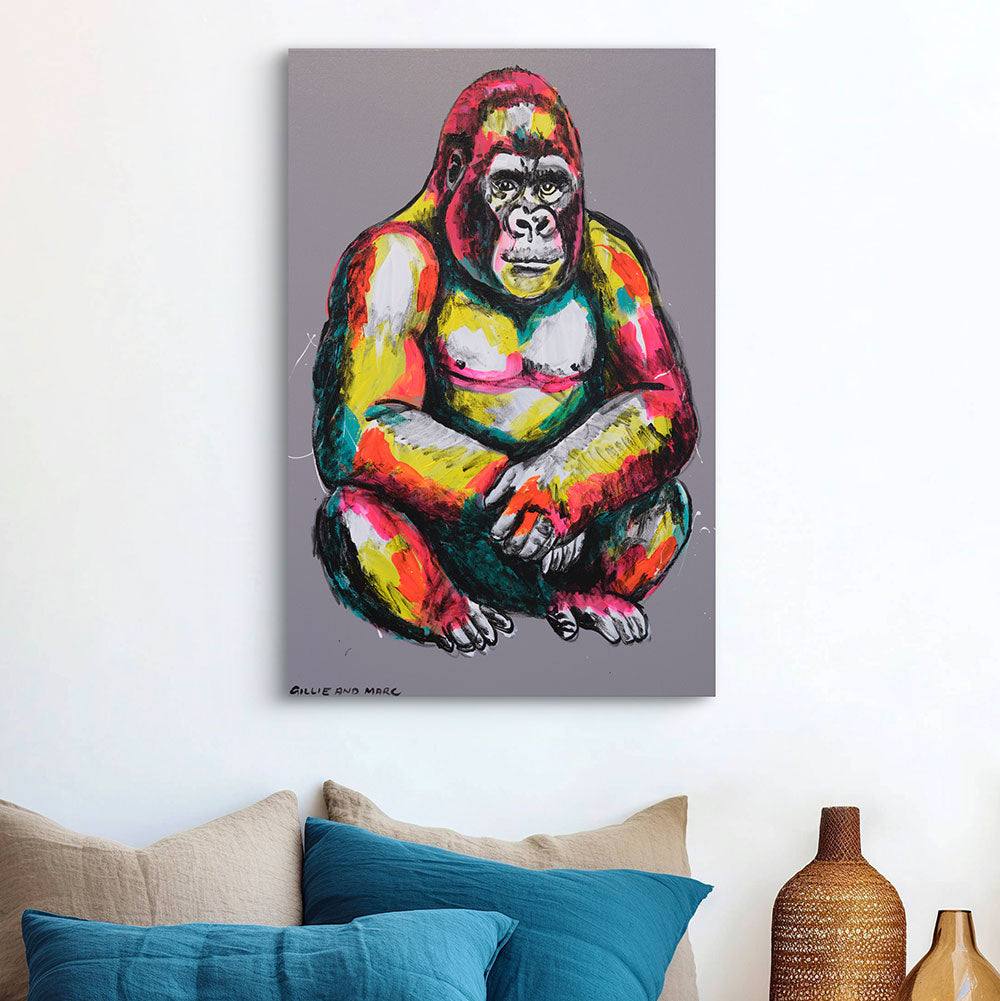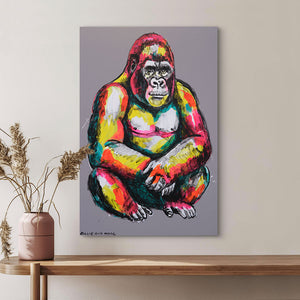 This striking piece portrays a colorful and powerful gorilla in a moment of calm. Seated and contemplative, the gorilla exudes a serene strength, with vibrant strokes of red, yellow, and blue covering its body. The artist’s bold use of color and expressive brushstrokes adds an energetic contrast to the soft gray background, creating a striking visual. The gorilla’s posture and expression convey a sense of peaceful solitude, making it both a powerful and soothing image.