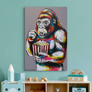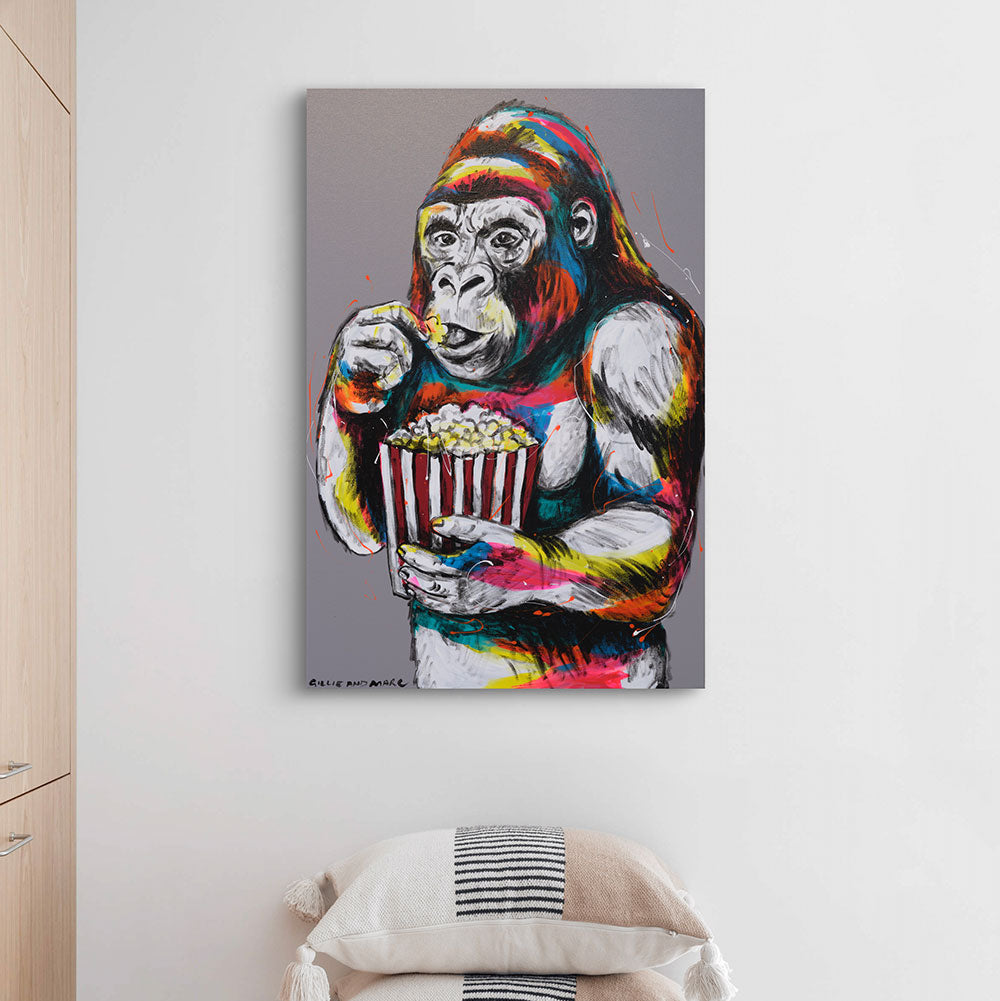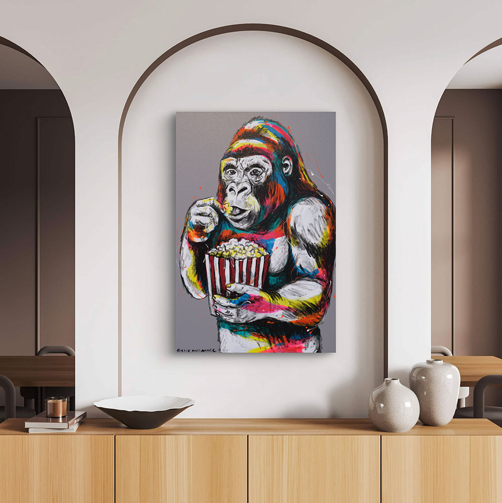 Gorilla Loves Popcorn is a playful and irresistibly charming portrait of a gorilla enjoying one of life’s simple pleasures—a bucket of buttery popcorn. With wide, focused eyes and a content expression, the gorilla brings a sense of quiet joy and relatability to the canvas. Bursts of neon pink, yellow, blue, and red streak through its fur, creating a vibrant contrast against the soft grey background. Gillie and Marc transform an ordinary moment into an extraordinary statement, reminding us that even the wildest beings share in the joy of small treats and cozy rituals.