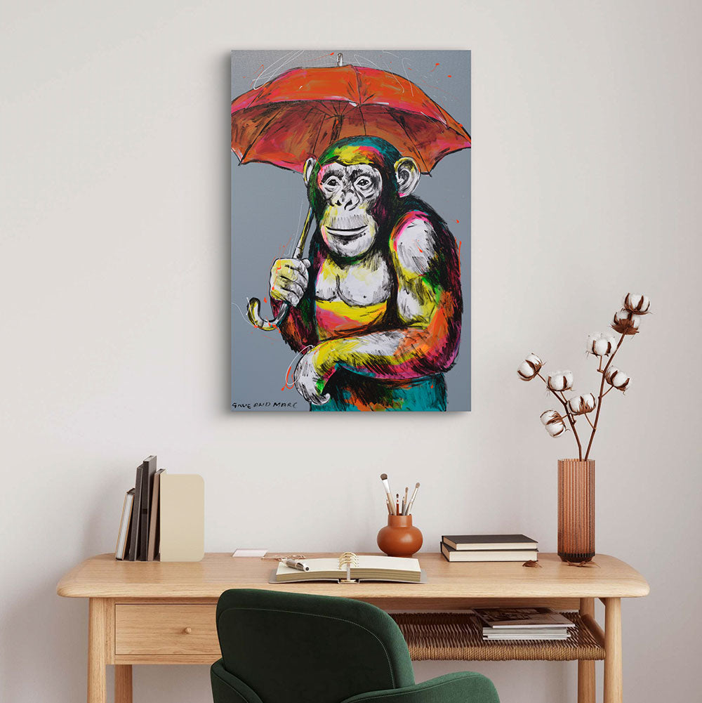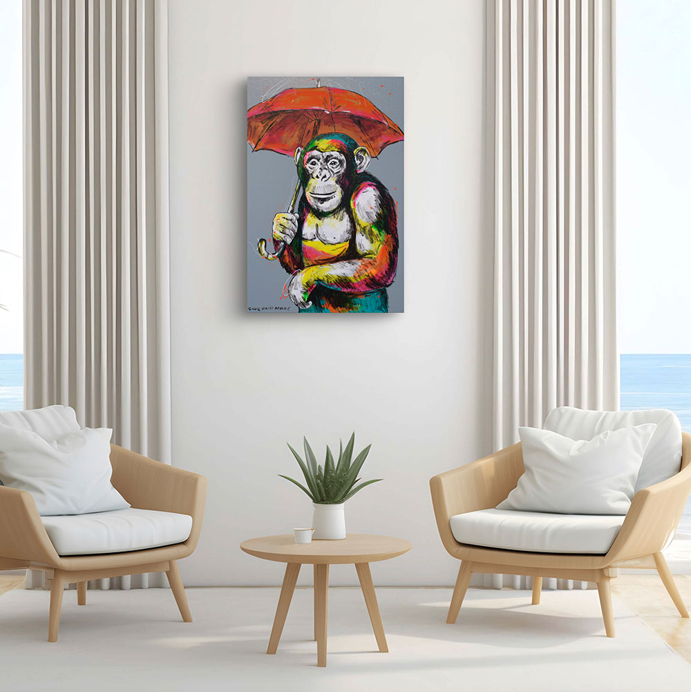 Let it Rain captures a peaceful yet playful moment as a vibrant chimpanzee stands holding a bright red umbrella, seemingly content beneath the drizzle. Splashed with radiant hues of yellow, pink, green, and orange, the chimp’s gentle expression exudes calm resilience and quiet optimism. Set against a soft grey background, the contrast allows every color to shine, enhancing the warmth of the scene. Gillie and Marc breathe emotional life into this charming figure, reminding us that even the simplest gestures—like sheltering from the rain—can carry profound meaning and beauty.