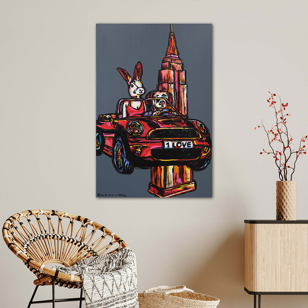 "New York Love" encapsulates a whimsical moment as Rabbitwoman and Dogman navigate the bustling streets of New York City in their miniature car, with the iconic Empire State Building towering in the background. The painting radiates a sense of adventure and unity, with the duo's carefree journey symbolizing the boundless possibilities and excitement of urban exploration. The focus remains on the vibrant characters and the iconic landmark, highlighting their shared joy and camaraderie amidst the bustling cityscape. Through its charm, the artwork invites viewers to embrace the magic of companionship and the timeless allure of the New York skyline.