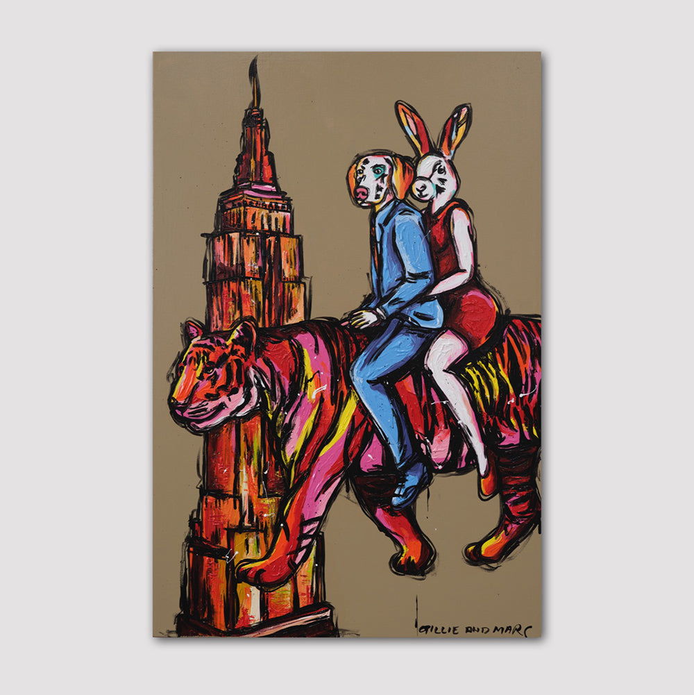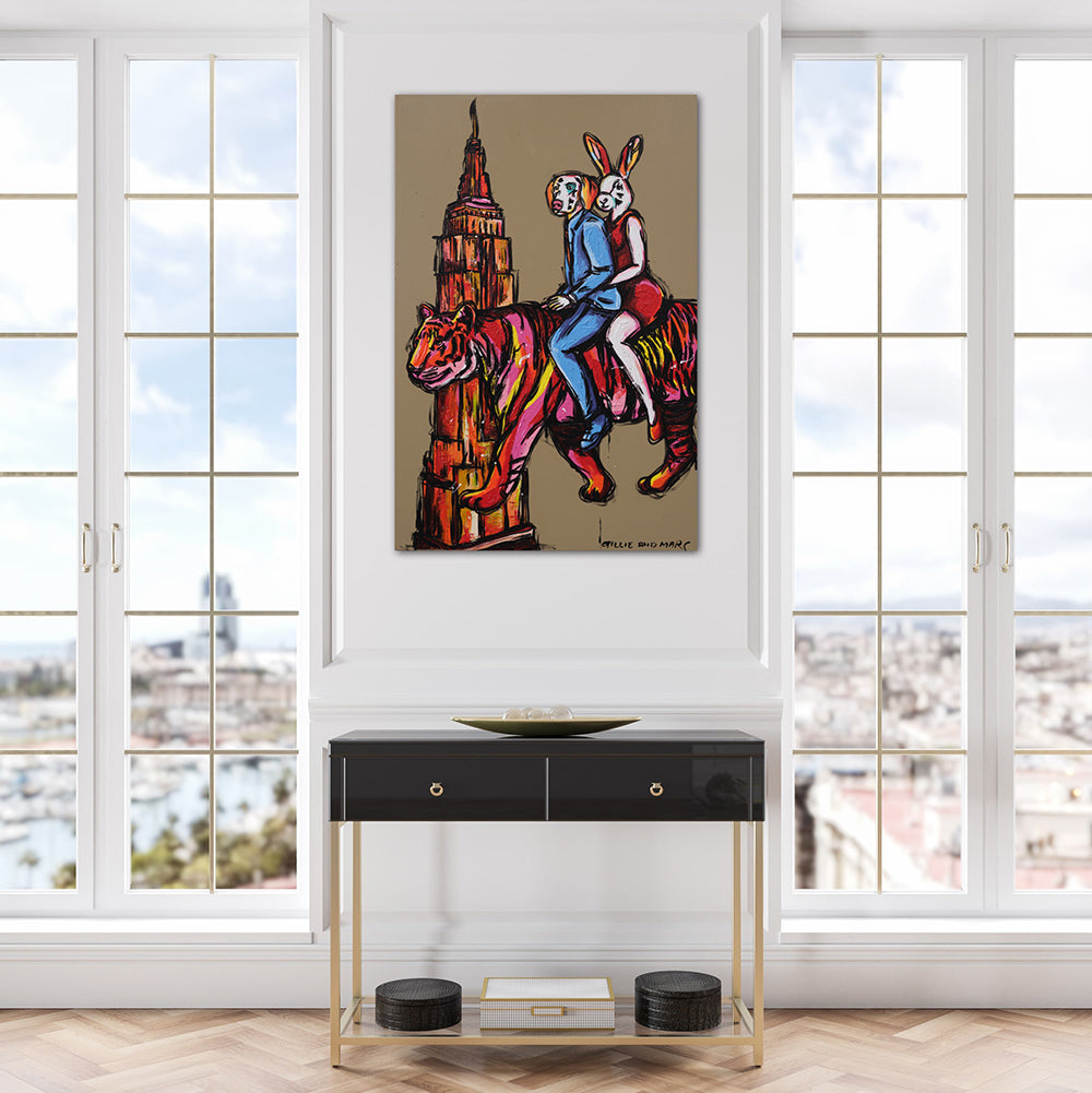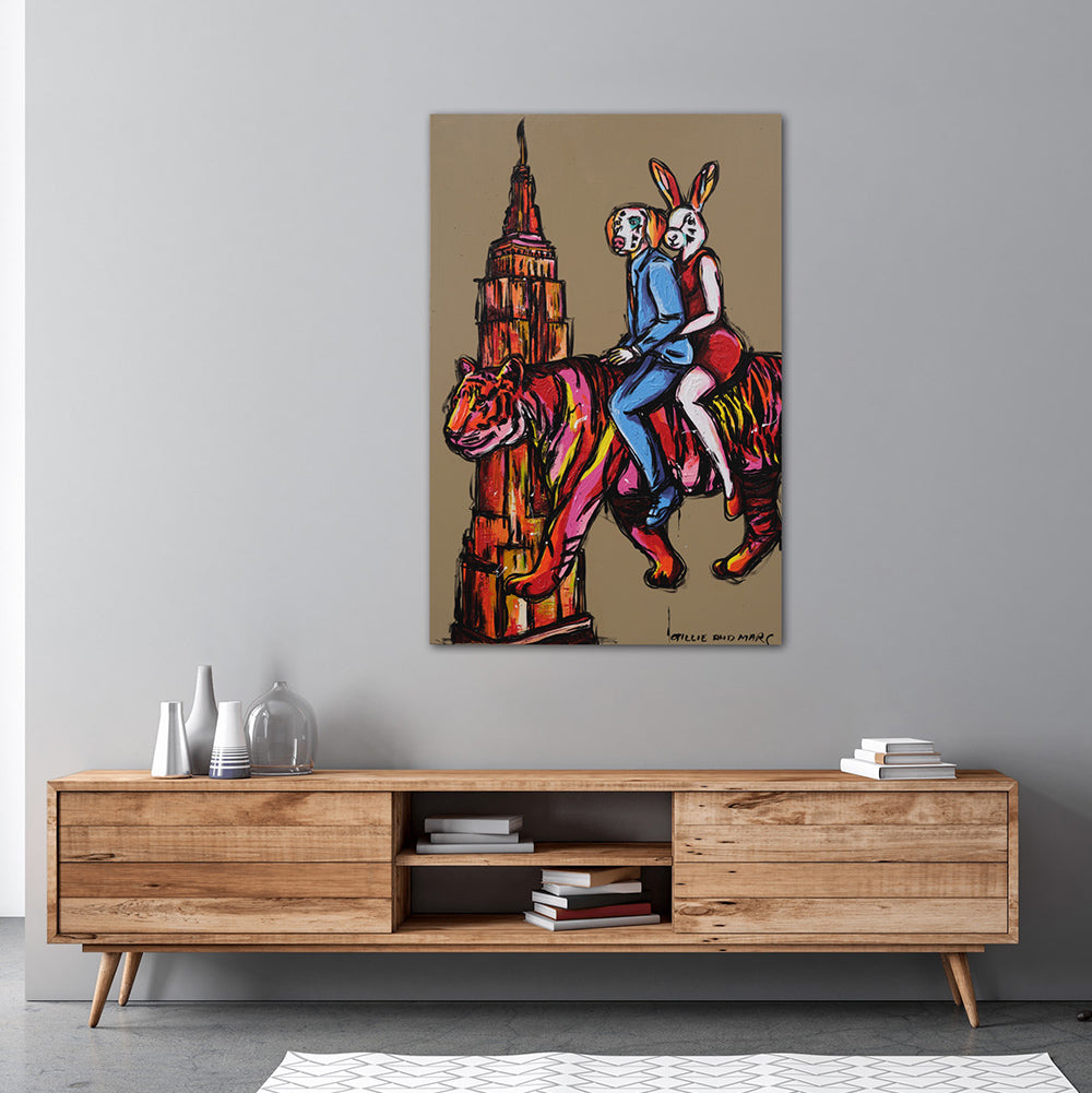 "New York Prowl" captures a mesmerizing scene as Rabbitwoman and Dogman boldly ride atop a majestic tiger through the vibrant streets of New York City, passing by the iconic Empire State Building. Against the backdrop of the bustling cityscape, the trio exudes a sense of power and adventure, their presence commanding attention amidst the urban chaos. The painting pulsates with energy and excitement as Rabbitwoman and Dogman navigate the streets with their feline companion, symbolizing courage and resilience in the face of the city's relentless hustle. Through its dynamic composition and bold imagery, the artwork invites viewers to join in the exhilarating journey through the heart of the Big Apple, where even the most unconventional modes of transportation can lead to extraordinary adventures.
