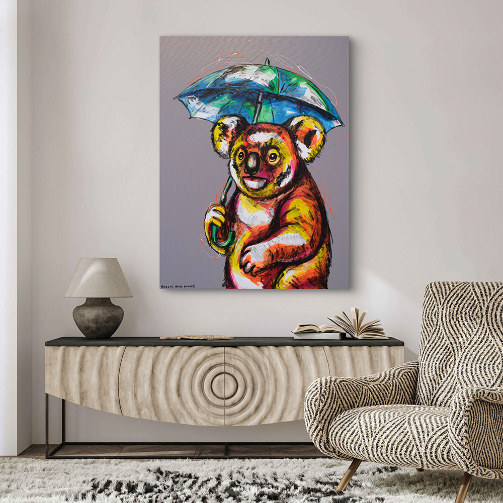 Rainy Day Koala radiates joy and resilience as a cheerful koala smiles beneath a bright blue and green umbrella, unfazed by the weather. The character’s vibrant fur glows with rich tones of yellow, red, and pink, creating a striking contrast against the soft grey background. With expressive eyes and a playful grin, this artwork captures a sense of childlike wonder and optimism. Gillie and Marc blend bold color and personality to create a celebration of life’s simple pleasures—even on the rainiest of days.