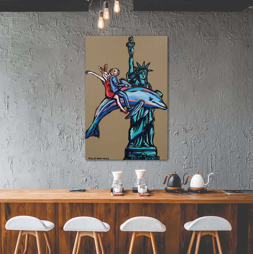 "Riding High in NYC" captures a whimsical and exhilarating moment as Dogman and Rabbitwoman ride atop a playful dolphin in front of the majestic Statue of Liberty in New York City. Against the backdrop of the solitary statue, the painting radiates with a sense of freedom and adventure as the trio navigates the waters with grace and joy. The dolphin's graceful leap symbolizes the boundless spirit of exploration and possibility, while Dogman and Rabbitwoman's expressions exude excitement and wonder. Through its dynamic composition and imaginative narrative, the artwork invites viewers to join in the fantastical journey through the iconic landmarks of New York City, where even the most unconventional modes of transportation can lead to unforgettable experiences.