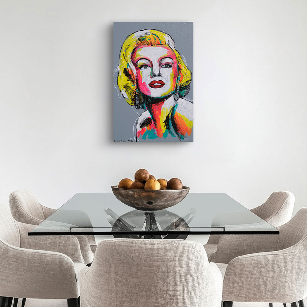 This vibrant, pop-art portrait captures the timeless allure of a Hollywood icon with a modern twist. The bold, expressive brushstrokes bring to life the figure of the woman, highlighted with bright hues of yellow, pink, and blue against a muted gray background. Her iconic blonde hair and striking red lips are reimagined through an energetic use of color, creating a captivating and dynamic rendition of a classic beauty. This painting celebrates her as more than an icon—she is the embodiment of glamour, confidence, and unforgettable charm.