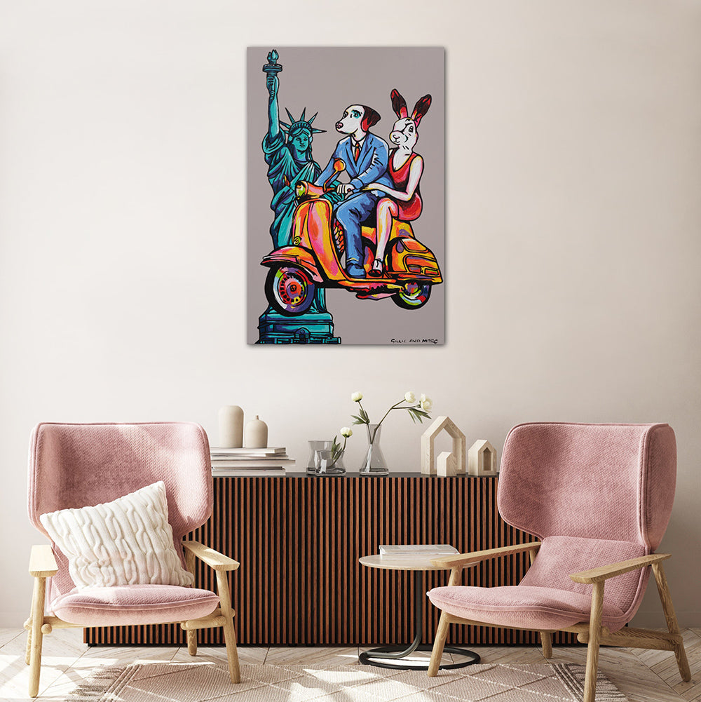 "Statue of Liberty Tour" captures a scene of adventure and exploration as Dogman and Rabbitwoman traverse the streets of New York City on their Vespa, with the iconic Statue of Liberty looming majestically in the background. Against the backdrop of the solitary statue, the painting evokes a sense of awe and wonder as the duo embarks on their journey through the bustling cityscape. The Vespa, a symbol of mobility and freedom, carries them effortlessly through the scene, while Dogman and Rabbitwoman's expressions reflect the excitement of discovery and the timeless allure of one of the world's most famous landmarks. Through its dynamic composition and vibrant imagery, the artwork invites viewers to join in the exhilarating tour through the heart of New York, where the Statue of Liberty stands as a powerful symbol of liberty and opportunity.