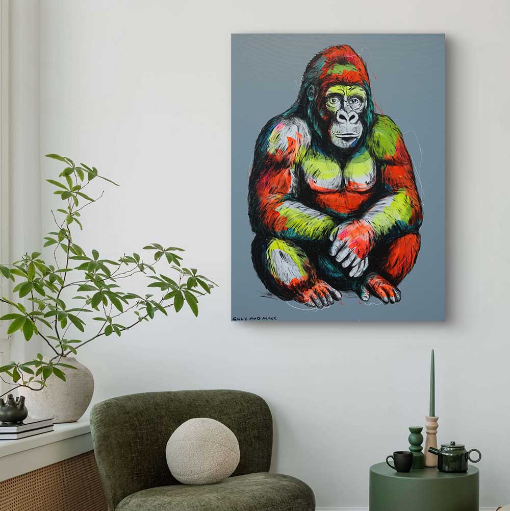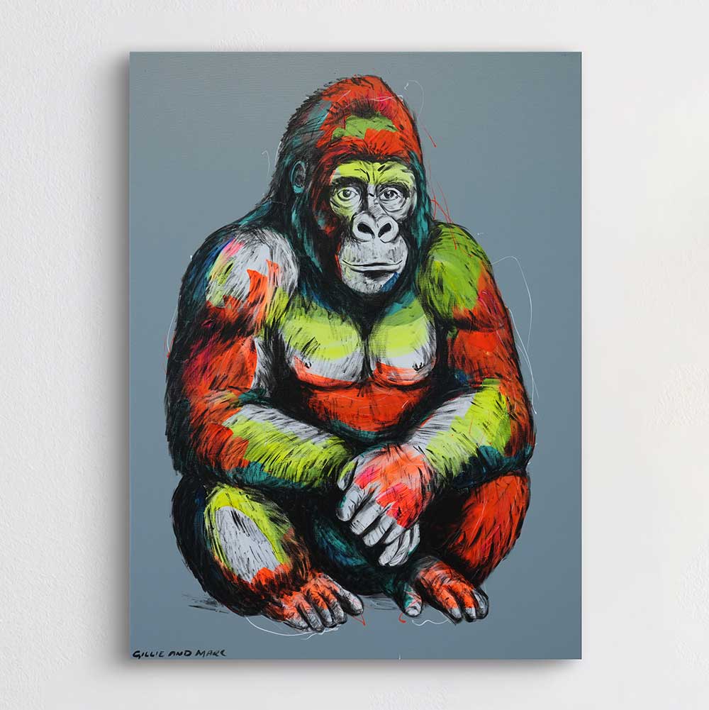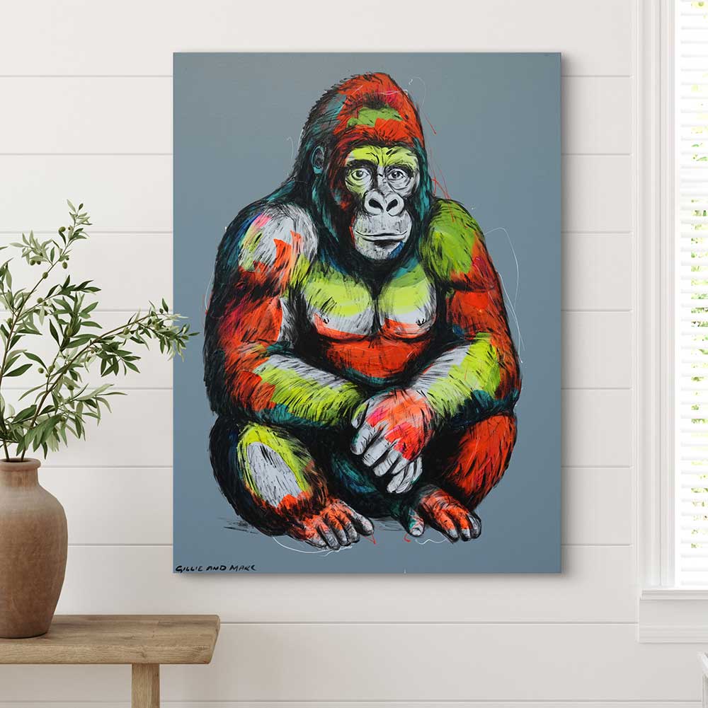 In striking hues of red, yellow, and lime green, this gentle gorilla sits cross-legged in serene contemplation. The grey background creates a quiet contrast, allowing his expressive form and soulful eyes to command attention. With every brushstroke, Stillness in the Wild captures a moment of introspection in nature’s untamed heart. It’s a celebration of presence, resilience, and the quiet dignity of one of our closest wild relatives.