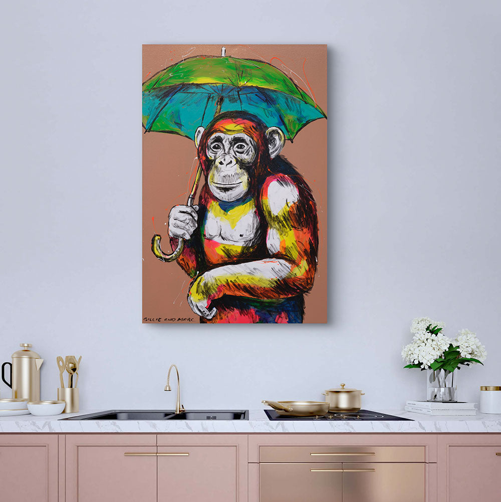 The Chimp Was In Heaven captures a heartwarming moment of pure contentment, as a chimpanzee stands with a serene smile beneath a bright green and blue umbrella. Painted in radiant tones of yellow, red, orange, and pink, the chimp’s joyful aura glows against the soft tan background. Its relaxed pose and gentle gaze suggest a sense of peace and simple happiness. Gillie and Marc use color and character to express a universal truth—that sometimes all it takes to feel like you’re in heaven is a little shelter and a moment to enjoy the rain.