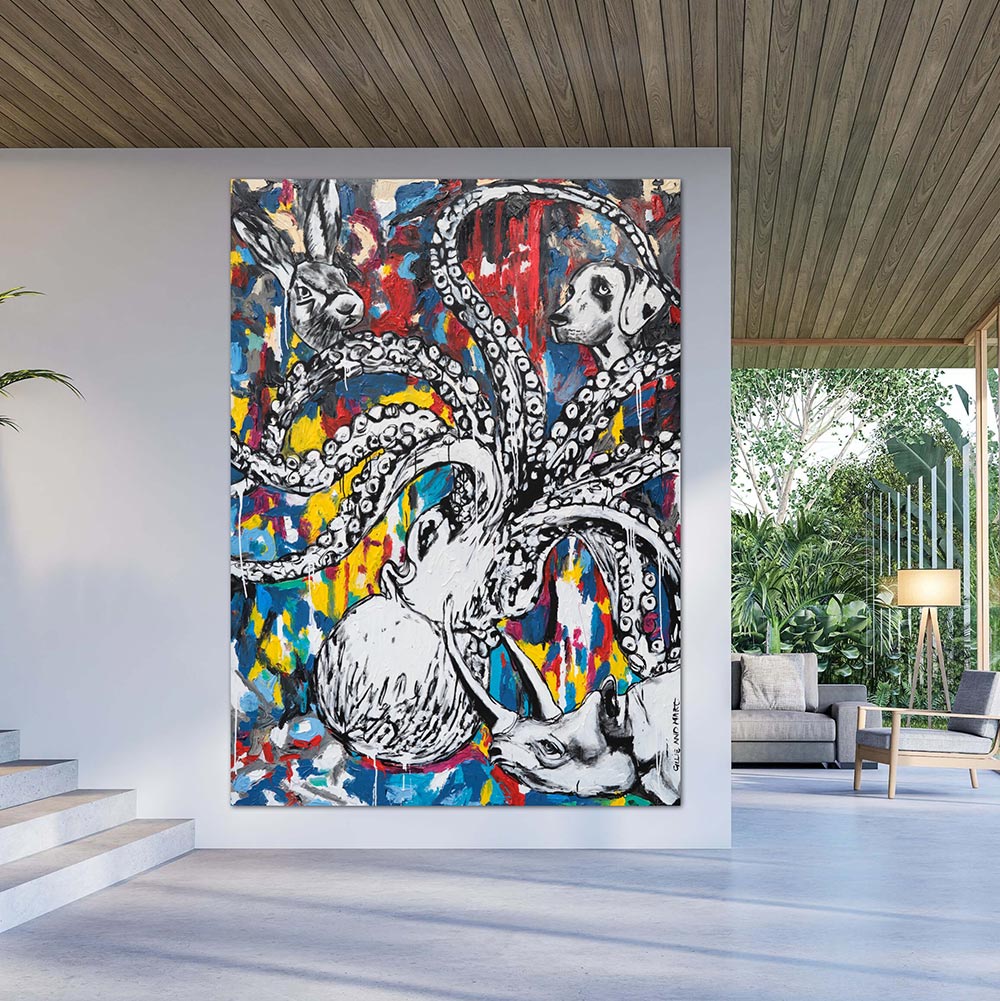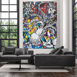 In the painting titled "The Fantastic Voyage of Rabbitwoman and Dogman" a captivating narrative unfolds as a Rabbitwoman, a dogman, an Octopus, and a Rhino converge in a harmonious blend within the thickly layered mixture of paint. This diverse ensemble of creatures, each with its unique traits and significance, embarks on an extraordinary journey together. Against the backdrop of swirling colors and textures, their interconnected presence illustrates the unity and interconnectedness of all living beings, regardless of their differences. This artwork celebrates the beauty of diversity and collaboration, inviting viewers to join Rabbitwoman and Dogman on their fantastical voyage through the rich tapestry of life's adventures and discoveries.