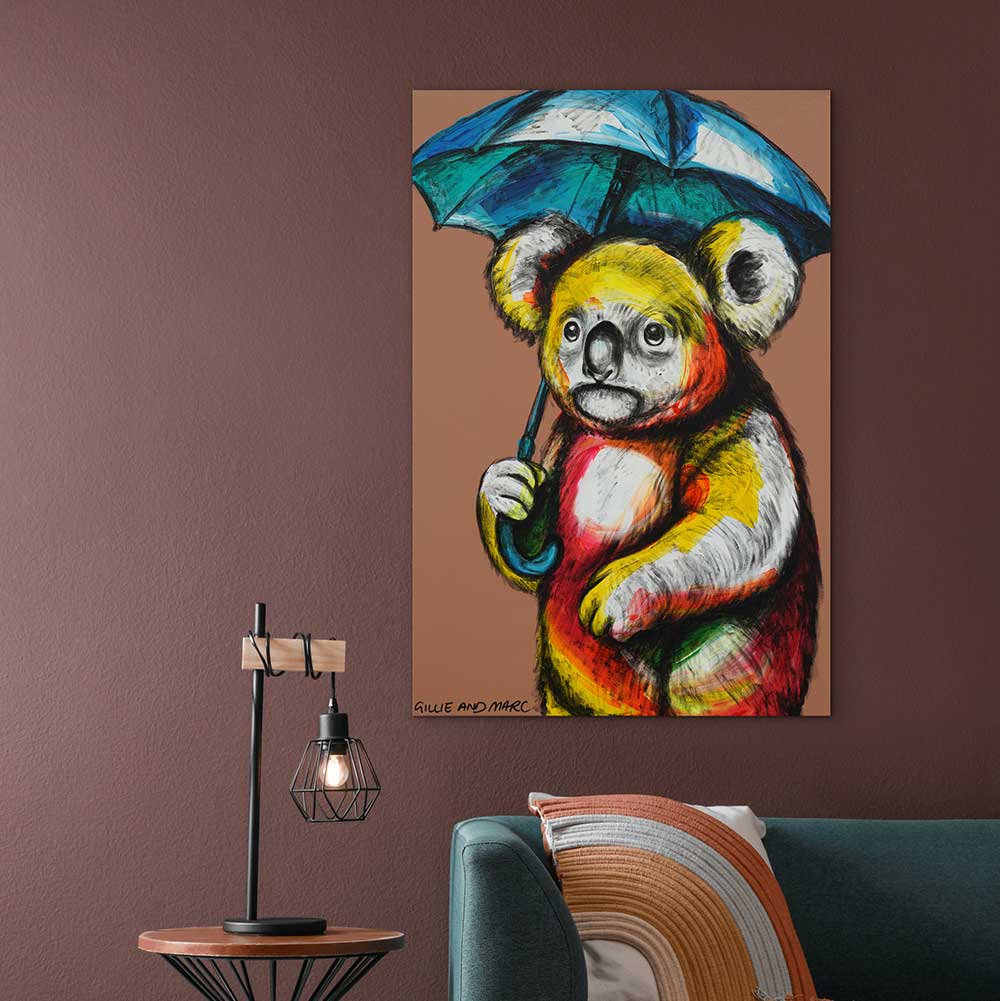A bright, multicoloured koala stands beneath a vivid blue umbrella, blending innocence with quiet strength. Bold strokes of yellow, red, and green bring warmth and life to the gentle figure. The soft gaze invites empathy, reminding viewers of the fragility and resilience of nature. Against the warm background, the scene radiates hope after the storm. This artwork celebrates protection, renewal, and the simple beauty of a calm moment.