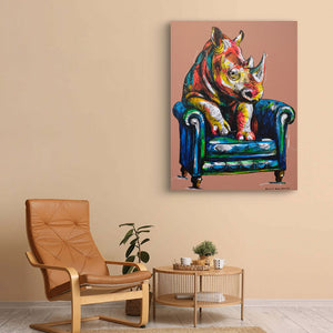 The Rhino Sat on It brings unexpected charm and humor to the canvas, as a powerful rhinoceros perches gently atop a luxurious, vividly painted blue armchair. With a body streaked in bold reds, yellows, and greens, the rhino’s form is both commanding and endearing. Its thoughtful gaze adds a layer of quiet emotion, contrasting delightfully with the playful absurdity of the scene. Set against a warm tan background, Gillie and Marc invite us to consider strength through a softer lens—where even the toughest creatures can enjoy a moment of stillness, comfort, and a good seat.