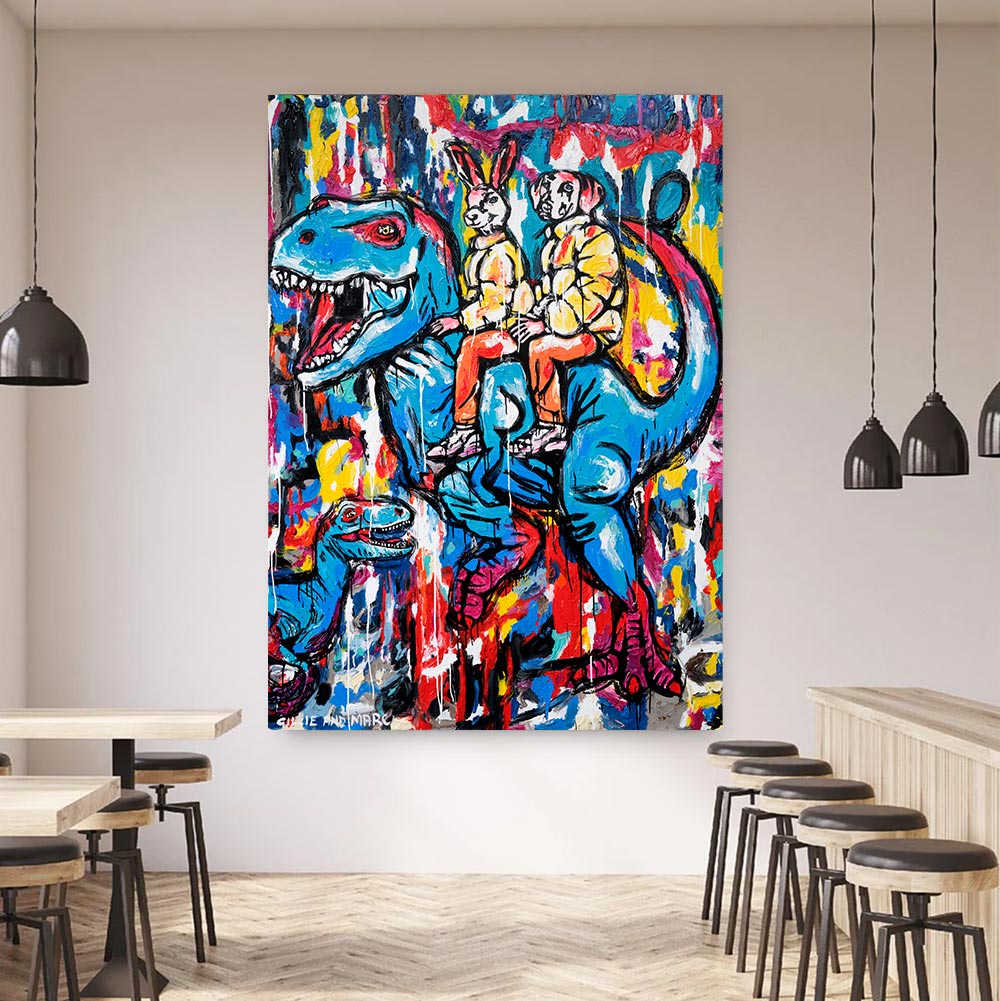 This is a captivating painting that transports viewers back in time to a prehistoric world filled with wonder and excitement. In this extraordinary artwork, Rabbitwoman and Dogman are seen riding atop a magnificent T-rex. The towering dinosaur, with its powerful strides and thunderous roars, carries them through a lush landscape teeming with various species of dinosaurs. The painting captures the sheer thrill and awe of this unlikely trio as they navigate their way through this ancient realm, their hearts pounding with every step. It is a scene that ignites the imagination and invites viewers to join in on this epic adventure, where the boundaries of time and possibility are delightfully blurred.