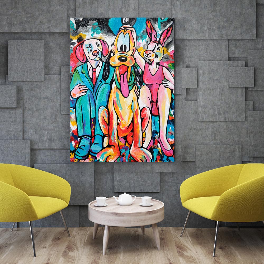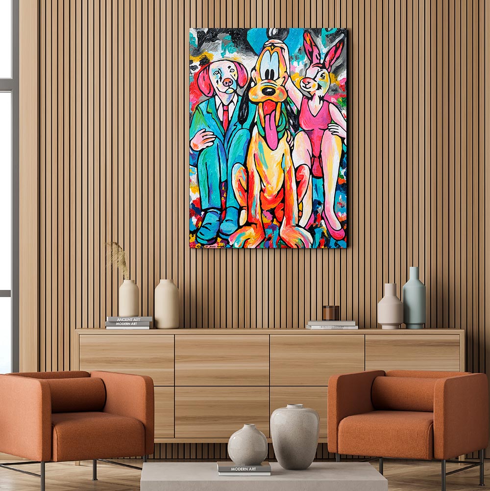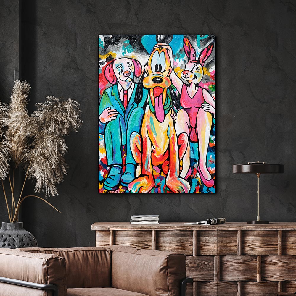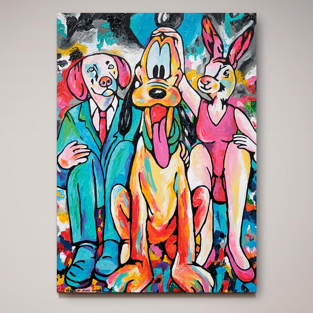 In the painting titled "They Were Best Friends," Dogman and Rabbitwoman are depicted side by side, gently patting Pluto with wide smiles adorning their faces. The trio exudes a palpable sense of happiness and contentment against a backdrop of textured, colorful paints. Pluto, with his tail wagging in delight, embodies the epitome of companionship and loyalty. As Dogman and Rabbitwoman shower him with affection, their bond strengthens, symbolizing the enduring power of friendship. Amidst the vibrant hues and intricate textures of the background, the scene captures a timeless moment of joy and camaraderie shared among kindred spirits.