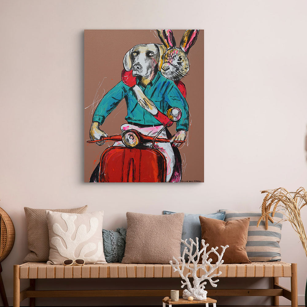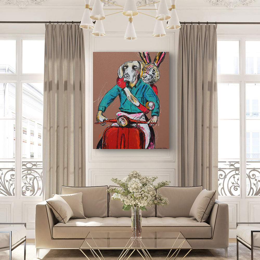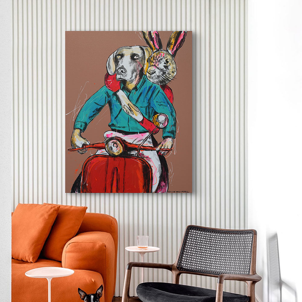 With Rabbitwoman holding on tightly, Dogman rides toward the unknown, their red scooter cutting through the quiet of change. There’s no map, just trust and the promise of something new. The earthy background and bold strokes highlight their grounded yet daring spirit. It's a moment of transition—filled with courage, love, and the thrill of new beginnings.