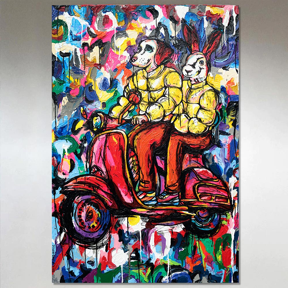 Vespa Heaven expertly captures the joy of an adventurous spirit, showing Rabbitwoman and Dogman embracing their wild side atop a vibrantly red Vespa. The mix of vivid color and a pop background conveys a sense of exciting possibility and bravado.