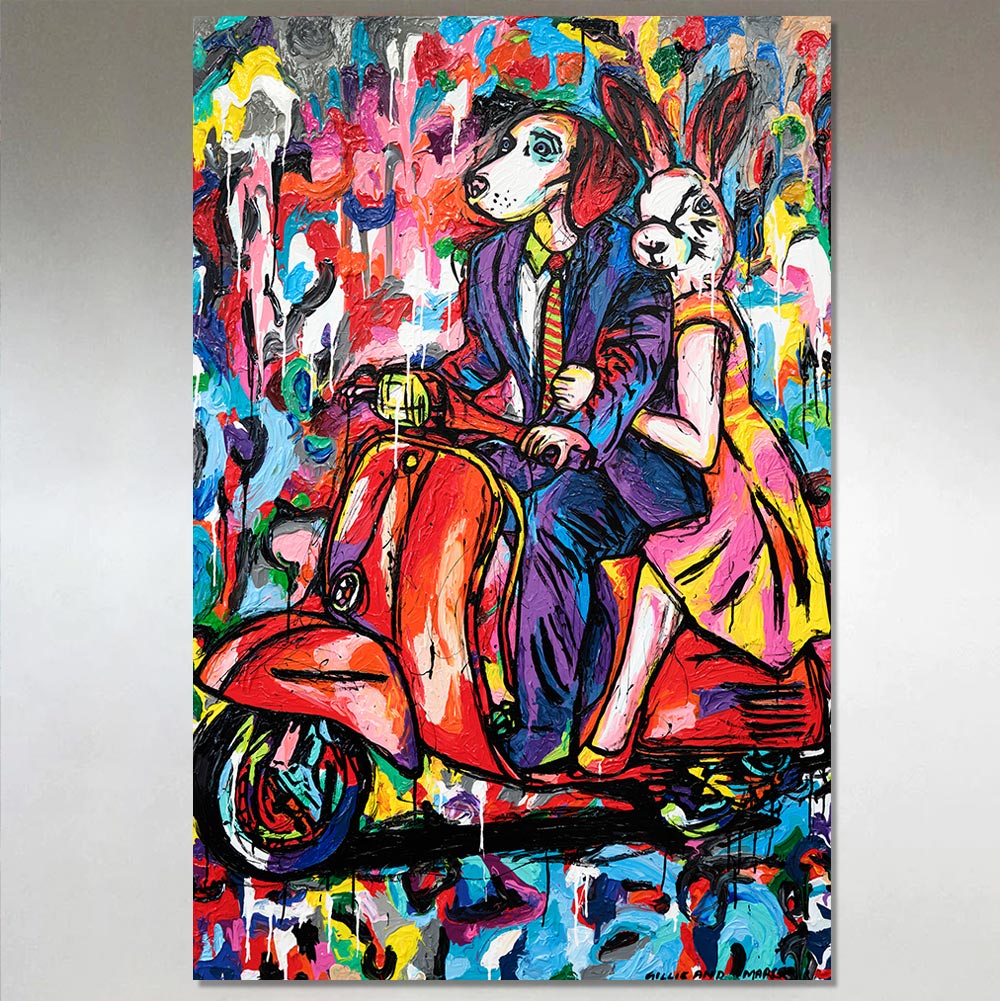 This colorful, original painting depicts Rabbitwoman and Dogman riding together on a Vespa, symbolizing a passionate and loving bond. The painting captures the unique and powerful connection between two characters. The vibrant colors used add dynamism to the artwork.