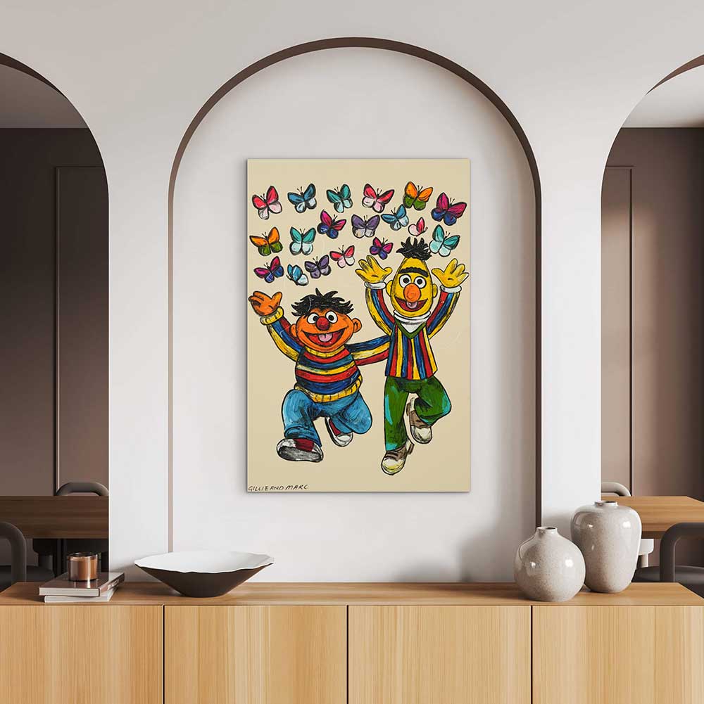 Description “Bert and Ernie Were Friends Forever” celebrates the pure joy of friendship through the beloved characters Bert and Ernie, reimagined with Gillie and Marc’s signature playful energy. Surrounded by a colourful flurry of butterflies, the duo leaps into the air with unrestrained happiness, capturing a moment of connection that feels both nostalgic and timeless.