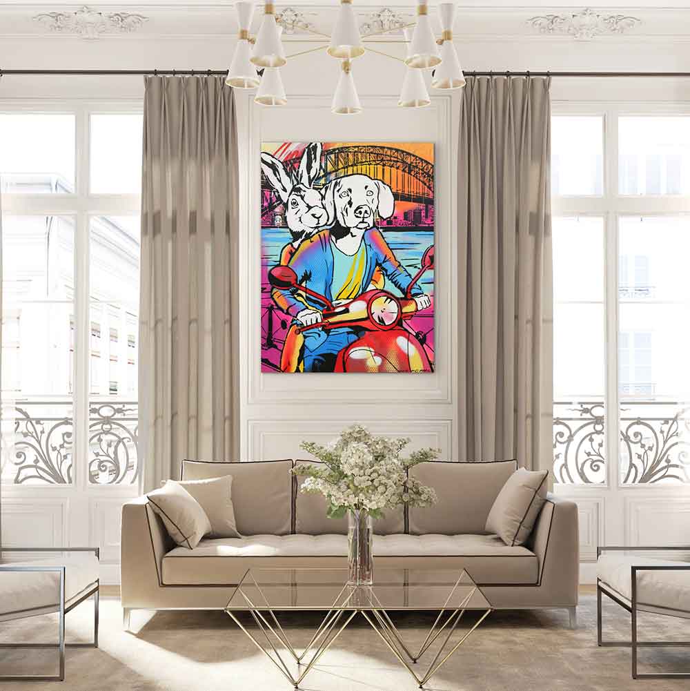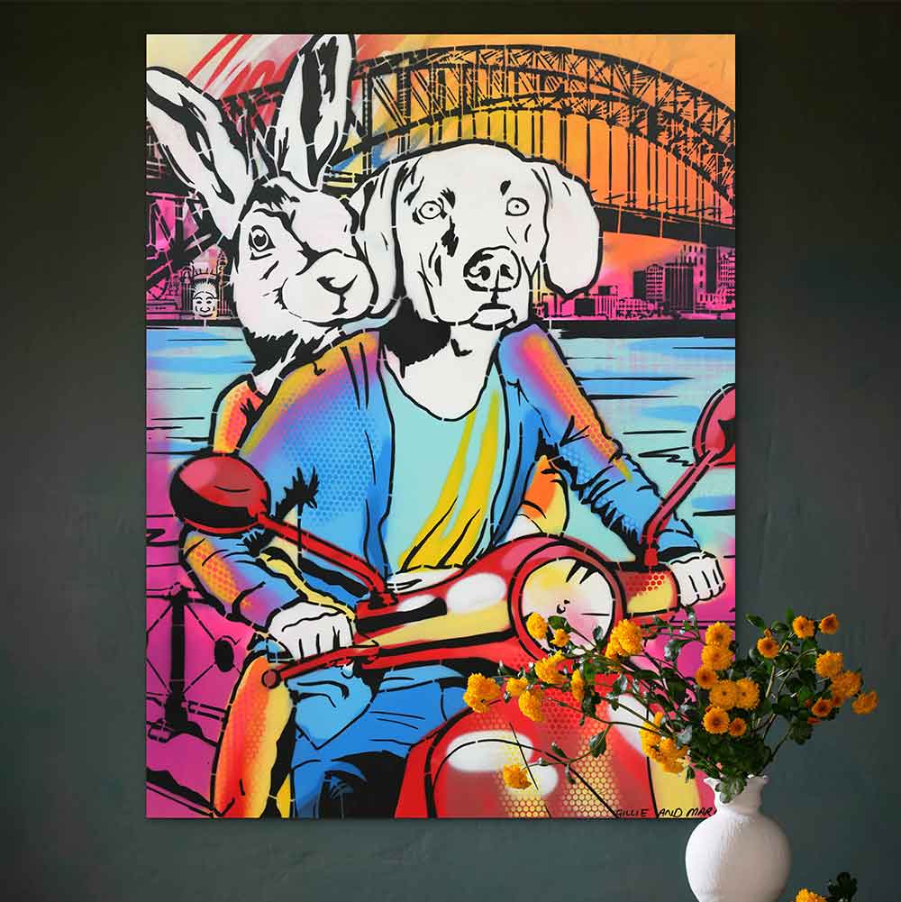 The purest example of the artist’s freehand work, Gillie and Marc’s Contemporary Street Paintings are a stunning series that pairs unashamedly bold colours with deep black line work to form intimate moments featuring their signature alter-egos, endangered wildlife and more. The carefully selected vivid colours and unmistakable imagery means no two pieces are alike and can have multiple meanings the more they are viewed. Gillie and Marc paint each unique canvas side-by-side ensuring love is engrained in every brushstroke of each one-of-a-kind work of art. Recently inspired by the pop style of Andy Warhol and the iconic stencils of street artists Banksy and Mr. Brainwash, Gillie and Marc expanded their collection with the edgy addition of using spray paint stencils on their canvases. The stark contrast of bright colours beneath a dark stencil breathes life into this limited series, embodying Gillie and Marc’s philosophy of accessible art by playfully bringing the street to the canvas.