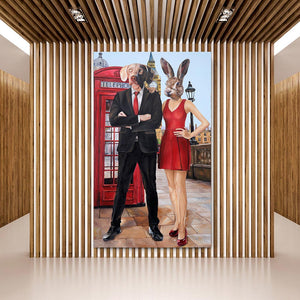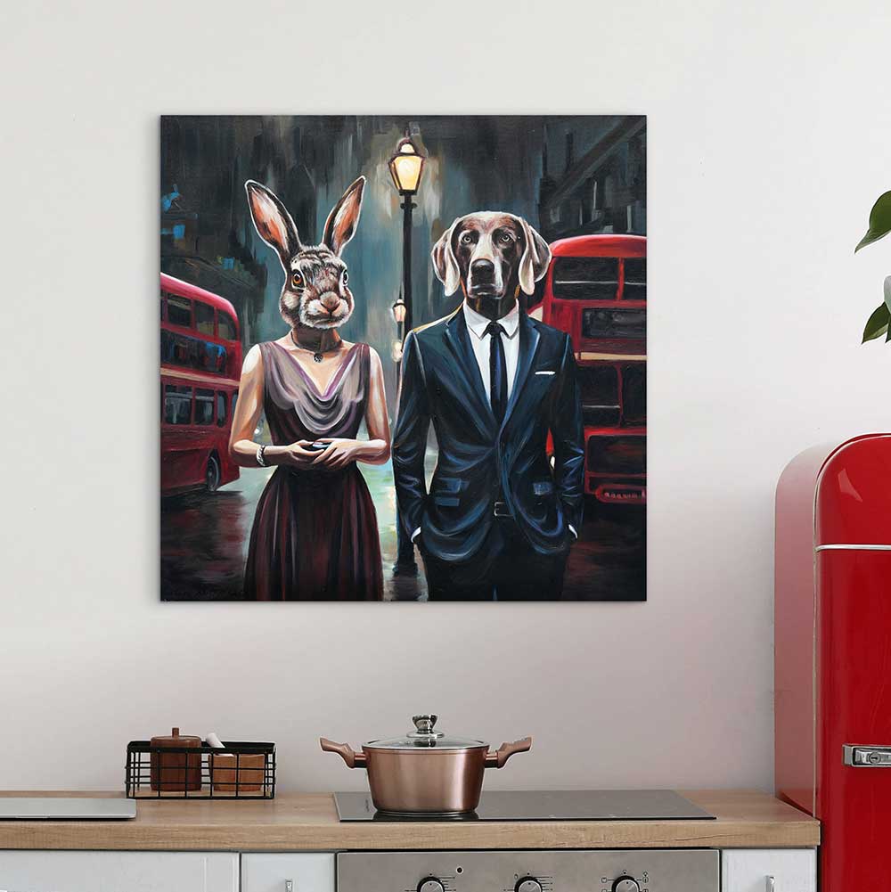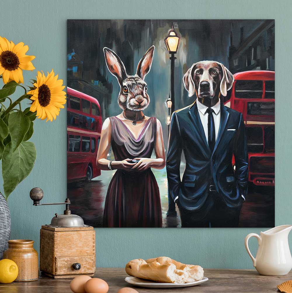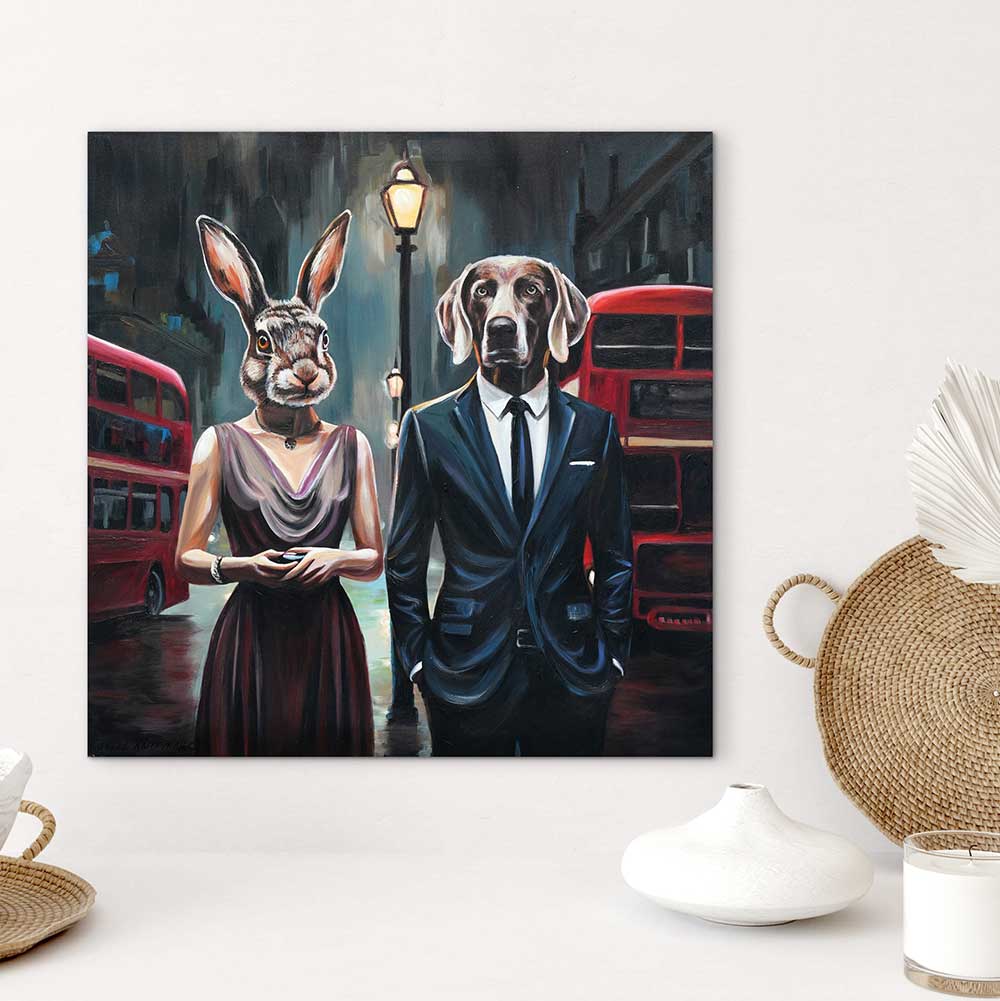 Description Set against the moody glow of a London evening, A Night They Would Never Forget captures Rabbitwoman and Dogman in a moment of quiet elegance and intrigue. Dressed in their finest attire, they stand beneath the city lights, surrounded by the hum of red double-decker buses and the soft shimmer of rain. The painting evokes themes of love, unity, and timeless companionship — a reminder that even in the busiest of worlds, true connection always shines through.
